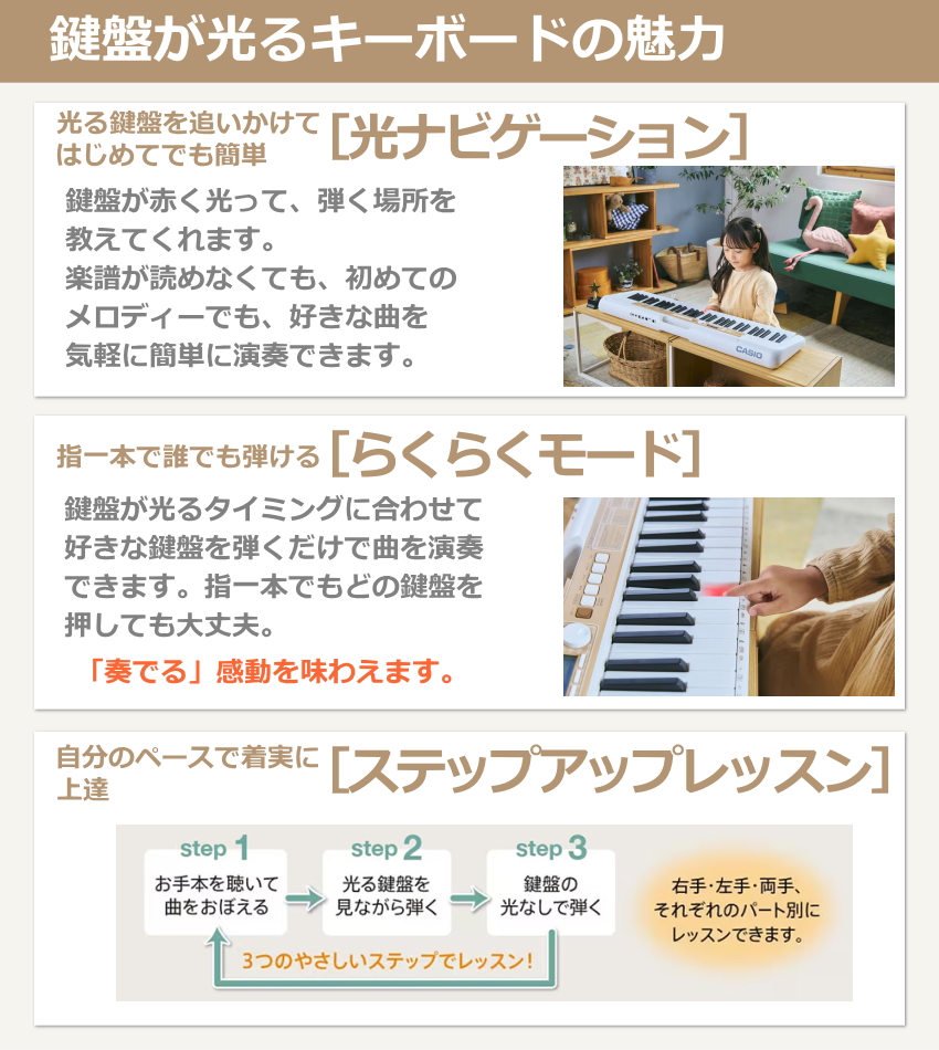 LKシリーズは”光る鍵盤”が特徴で、内蔵曲も豊富。モデルチェンジは1年に1度行われております。
