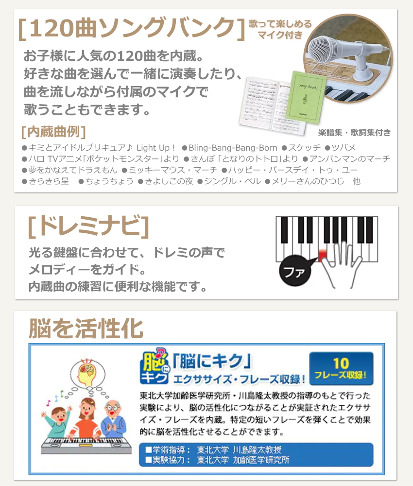 劇的に機能が向上することは近年あまりございませんが、内蔵曲は1年間の流行りの曲が採用されますので毎年新たな曲と入れ替わっております。