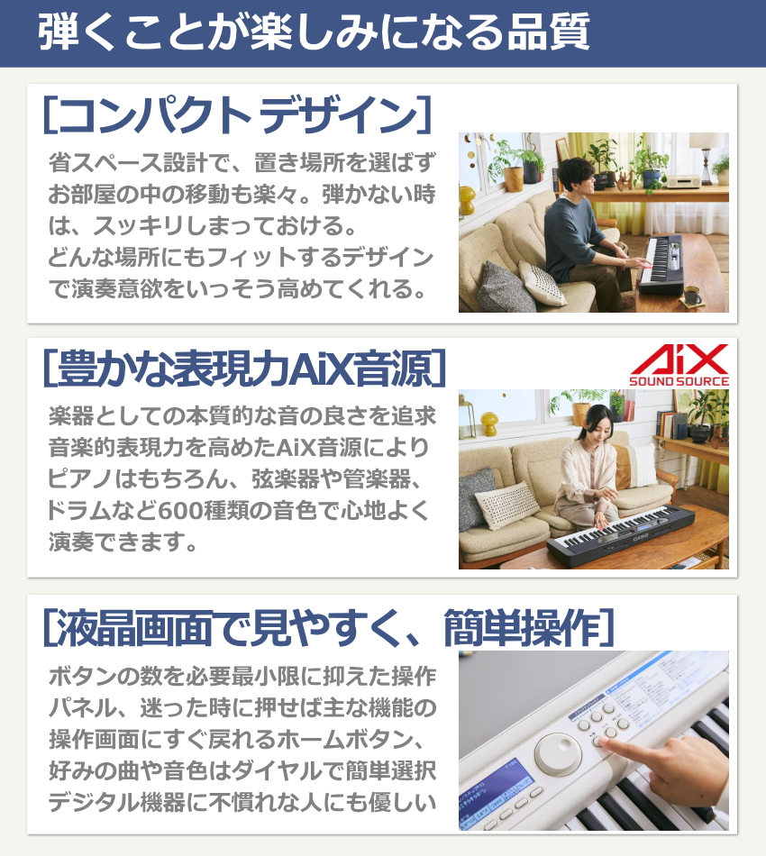 カシオキーボードの中で最もポピュラーなシリーズがLKシリーズです。LKシリーズは拡張を目的に様々な機能や接続端子が装備された上位機種と、1台完結でお楽しみいただくタイプの2機種がございます。