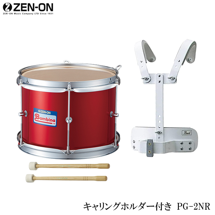 | 保育園や幼稚園など子供がいる施設では定番となりつつある教育楽器、マーチングドラム(テナードラム)です。 当商品は幼児向け(主に小学生以下程度)に作られたシリーズです。 最近では保育園や幼稚園からのお問い合わせも非常に多い人気の打楽器です。 本商品は教育向け楽器も扱うの老舗楽器メーカー、「ゼンオン(全音楽譜出版社)」のバンビーナ、ポピュラーグレードシリーズのマーチングドラムで、幼児向けマーチングドラムの定番といえるモデルです。 子供でも扱い易い軽量タイプ(重量:約2.0Kg)で、重たいものに比べると長時間の演奏にも向いています。 初めて太鼓に触れられるお子様にも扱い易く、将来のステップアップにつながるしっかりした作りと音色が特徴です。 ■新たにモデルチェンジしたバンビーナPGシリーズ! 本商品はこれまで定番として永らく販売されていた「PG-2」の後継機種となります。 音質や重量などはほぼそのままですが、吊りバンドがこの度より付属しなくなります。 昨今では吊りバンドより専用のキャリングホルダーが多く扱われはじめ、マーチング市場でも流れは完全にキャリングホルダーへ移行しつつあります。 背景としては、やはり吊りバンドでは演奏時にお子様に負担が多く掛かるのが大きな理由となっており、肩にしっかりフィットし安定感のあるキャリングホルダーのほうが適しているという事が認知されている点があります。 吊りバンドは価格もキャリングホルダーに比べ安価なのですが、耐久性やお子様への負担の面ではキャリングホルダーをお勧めしています。 また、これまではキャリングホルダーを取り付ける為には専用の「ブラケット(キャリングホルダーを付けるための受け具)」が別売で、お客様で太鼓の側面に取り付けて頂く負担があったのですが、本モデルからは、最初からブラケットが太鼓に装着されています。この点が一番大きな改良点といえます。 キャリングホルダー自体は別売なのですが、取り付けに必要な作業はなくなり、扱いやすさが格段にアップした形となります。 ■マーチングドラムの基本的な種類 マーチングドラムには大きく分けて3種類の太鼓があります。 バスドラムはマーチングなどでも、一番低い低音をドンッドンッと支える、アンサンブルに重みを加える楽器になります。 またスネアドラムは特徴である打面裏のスナッピー(響き線)の効果でジャラッとした「タン!タタタタン!タンタン!」という高音域の特徴を持っています。 本商品、テナードラムはスネアドラムの響き線を無くしたタイプの物で主にバスドラムとスネアドラムの間を担当する中音域特性のドラムになります。 使用する環境やアンサンブルの編成によっては、スティックで叩いたりマレットで叩いたりします。 昨今では保育園や幼稚園など、音楽に力を入れている教育現場がひじょうに増えてきております。 やはりみんなで音を出す楽しさ、個々の楽器のアンサンブル(合奏)することによる協調性などの育成などに音楽はひじょうに向いています。 本商品の特徴 ■特徴 打面に貼ってあるヘッド(革)はマーチングドラムに適した専用のヘッドを装着しています。 音色は明るく元気の良い響きを持っていて、音の歯切れも良い心地よいビート感が表現出来ます。 重量は2.0kgと比較的軽く、お子様が演奏するのにストレスを極力軽減出来るように設計されています。 ■専用のキャリングホルダー付属! パールより発売されているマーチングキャリングホルダー(肩に掛けてドラムを腰の辺りに固定するホルダー)をお付け致します。 使えば本格的なマーチングバンドや行進などに使えます。マーチングの演奏の活動や発表の場も広がります。 重量は1.1kgで比較的軽い設計となり、お子様への重さの負担も最小限と言えるキャリングホルダーです。 (※身長90〜120cm向けです)※在庫状況によっては類似のキャリングホルダーに変更になります。 ■選べる2色カラー展開! 本商品はマーチングドラムとしては珍しくカラー展開が豊富です。 色は、赤、白、の2色のご用意があります。 マーチングドラムはパール以外のメーカーでも「スズキ(鈴木)」や「ヤマハ」、「TAMA(タマ)」など様々なメーカーが 製造しておりますが、当店ランキングでは幼児向けのものとしては比較的、パールのものが需要が高い印象があります。 幼児向けとはいえ、ある程度の本格的なものをお探しの方にはオススメできる機種と言えます。 | ||||||||||||