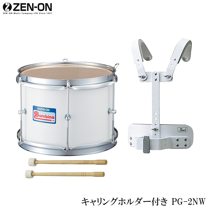 | 保育園や幼稚園など子供がいる施設では定番となりつつある教育楽器、マーチングドラム(テナードラム)です。 当商品は幼児向け(主に小学生以下程度)に作られたシリーズです。 最近では保育園や幼稚園からのお問い合わせも非常に多い人気の打楽器です。 本商品は教育向け楽器も扱うの老舗楽器メーカー、「ゼンオン(全音楽譜出版社)」のバンビーナ、ポピュラーグレードシリーズのマーチングドラムで、幼児向けマーチングドラムの定番といえるモデルです。 子供でも扱い易い軽量タイプ(重量:約2.0Kg)で、重たいものに比べると長時間の演奏にも向いています。 初めて太鼓に触れられるお子様にも扱い易く、将来のステップアップにつながるしっかりした作りと音色が特徴です。 ■新たにモデルチェンジしたバンビーナPGシリーズ! 本商品はこれまで定番として永らく販売されていた「PG-2」の後継機種となります。 音質や重量などはほぼそのままですが、吊りバンドがこの度より付属しなくなります。 昨今では吊りバンドより専用のキャリングホルダーが多く扱われはじめ、マーチング市場でも流れは完全にキャリングホルダーへ移行しつつあります。 背景としては、やはり吊りバンドでは演奏時にお子様に負担が多く掛かるのが大きな理由となっており、肩にしっかりフィットし安定感のあるキャリングホルダーのほうが適しているという事が認知されている点があります。 吊りバンドは価格もキャリングホルダーに比べ安価なのですが、耐久性やお子様への負担の面ではキャリングホルダーをお勧めしています。 また、これまではキャリングホルダーを取り付ける為には専用の「ブラケット(キャリングホルダーを付けるための受け具)」が別売で、お客様で太鼓の側面に取り付けて頂く負担があったのですが、本モデルからは、最初からブラケットが太鼓に装着されています。この点が一番大きな改良点といえます。 キャリングホルダー自体は別売なのですが、取り付けに必要な作業はなくなり、扱いやすさが格段にアップした形となります。 ■マーチングドラムの基本的な種類 マーチングドラムには大きく分けて3種類の太鼓があります。 バスドラムはマーチングなどでも、一番低い低音をドンッドンッと支える、アンサンブルに重みを加える楽器になります。 またスネアドラムは特徴である打面裏のスナッピー(響き線)の効果でジャラッとした「タン!タタタタン!タンタン!」という高音域の特徴を持っています。 本商品、テナードラムはスネアドラムの響き線を無くしたタイプの物で主にバスドラムとスネアドラムの間を担当する中音域特性のドラムになります。 使用する環境やアンサンブルの編成によっては、スティックで叩いたりマレットで叩いたりします。 昨今では保育園や幼稚園など、音楽に力を入れている教育現場がひじょうに増えてきております。 やはりみんなで音を出す楽しさ、個々の楽器のアンサンブル(合奏)することによる協調性などの育成などに音楽はひじょうに向いています。 本商品の特徴 ■特徴 打面に貼ってあるヘッド(革)はマーチングドラムに適した専用のヘッドを装着しています。 音色は明るく元気の良い響きを持っていて、音の歯切れも良い心地よいビート感が表現出来ます。 重量は2.0kgと比較的軽く、お子様が演奏するのにストレスを極力軽減出来るように設計されています。 ■専用のキャリングホルダー付属! パールより発売されているマーチングキャリングホルダー(肩に掛けてドラムを腰の辺りに固定するホルダー)をお付け致します。 使えば本格的なマーチングバンドや行進などに使えます。マーチングの演奏の活動や発表の場も広がります。 重量は1.1kgで比較的軽い設計となり、お子様への重さの負担も最小限と言えるキャリングホルダーです。 (※身長90〜120cm向けです)※在庫状況によっては類似のキャリングホルダーに変更になります。 ■選べる2色カラー展開! 本商品はマーチングドラムとしては珍しくカラー展開が豊富です。 色は、赤、白、の2色のご用意があります。 マーチングドラムはパール以外のメーカーでも「スズキ(鈴木)」や「ヤマハ」、「TAMA(タマ)」など様々なメーカーが 製造しておりますが、当店ランキングでは幼児向けのものとしては比較的、パールのものが需要が高い印象があります。 幼児向けとはいえ、ある程度の本格的なものをお探しの方にはオススメできる機種と言えます。 | ||||||||||||