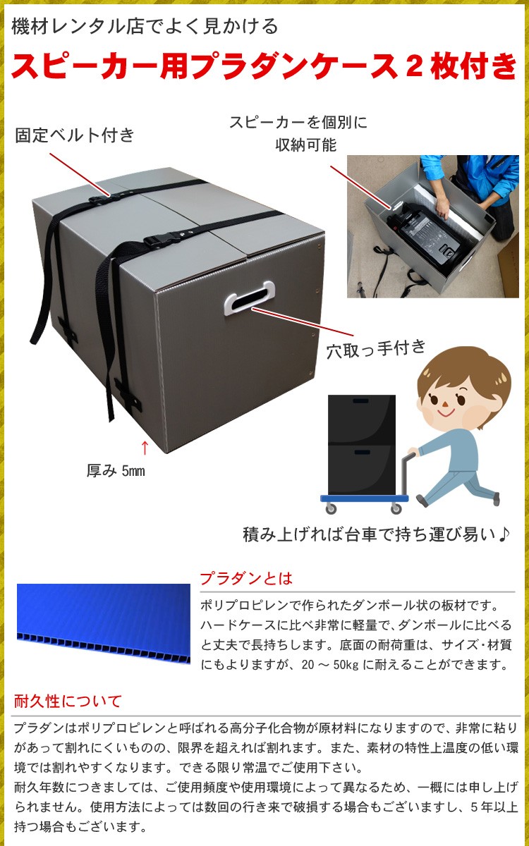音響機材のレンタル業者様や現場でよく見かけるようになったプラダンケースです。ハードケースは頑丈だけれど、重たすぎる。ということで最近ではハードケースをプラダンケースへ切り替えていく業者様も増えています。