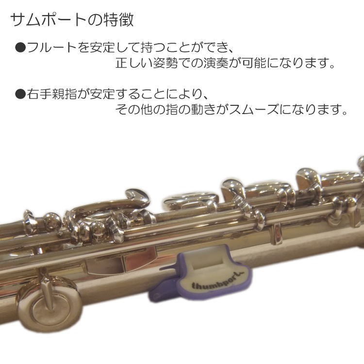 フルートを演奏するうえで、意外に難しいのが持ち方(姿勢)です。 フルートの持ち方は3点支持と呼ばれ、左手人差し指付け根、右手親指、口元の3か所で支えて持つのが正しい構え方です。 本商品「サムポート」はその持ち方をサポートしてくれる優れものです! 右手親指の位置や角度が安定することにより、全体の指が動きやすくなり安定した演奏が可能になります。