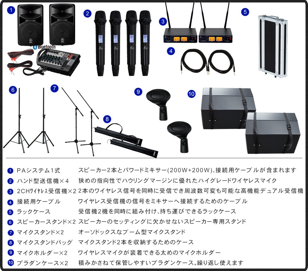 | イベント・お祭りなどに最適なワイヤレスマイク4本+ 収納用ケース付きセット | ||||||||||||||||||||||