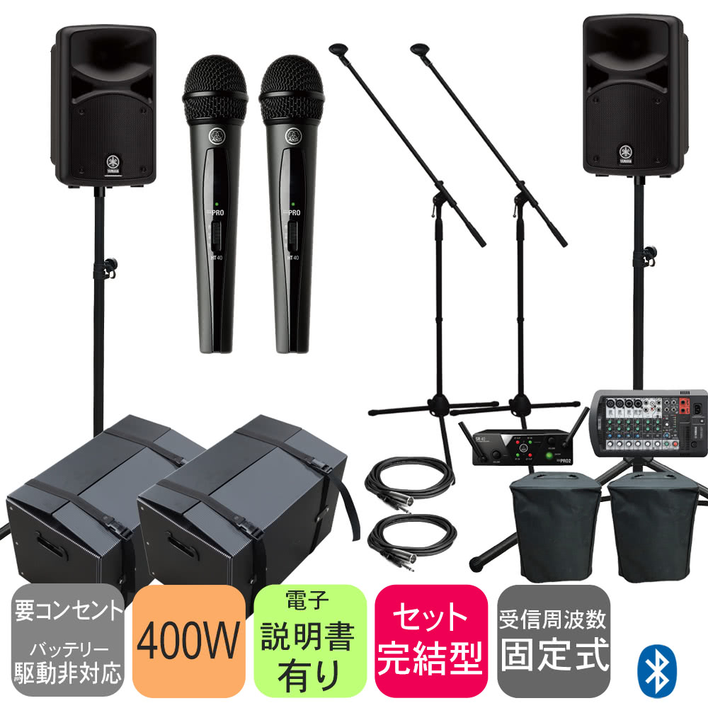 | Q.有線マイクは何本まで接続できますか? A.ワイヤレスマイク使用時は、追加で2本の有線マイクを接続することができます。接続ケーブルはXLRキャノンタイプをご利用ください。入力数が不足する場合は別途ミキサーをご利用頂くことで対応することもできます。 Q.電池またはバッテリーで使用することはできますか? A.当セットは電池駆動に対応していません。AC 電源でお使いください。電池駆動可能なスピーカーのお取り扱いもございますので、お求めの方は当社のPAセットページをご覧頂けましたら幸いです。 Q.セットのほかに必要なものはありますか? A.当セットの内容物のみで音は出力できますが、必要に応じてマイクやケーブルをご用意下さい。 | ||||||||||||||||||||||