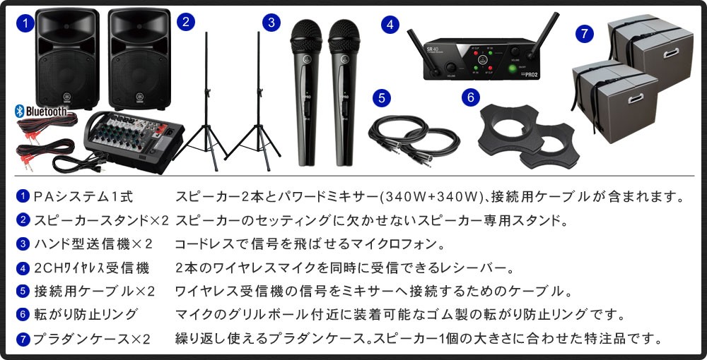 StagePAS600BT(スピーカー2本・パワードミキサー1個・スピーカーケーブル付き)/プラダンケース×2/スピーカースタンド×2/AKGワイヤレスマイク(HT40 MINI PRO)×2/転がり防止リング×2/2CHワイヤレス受信機(SR40 MINI PRO2)×1/バランス接続用ケーブル×2