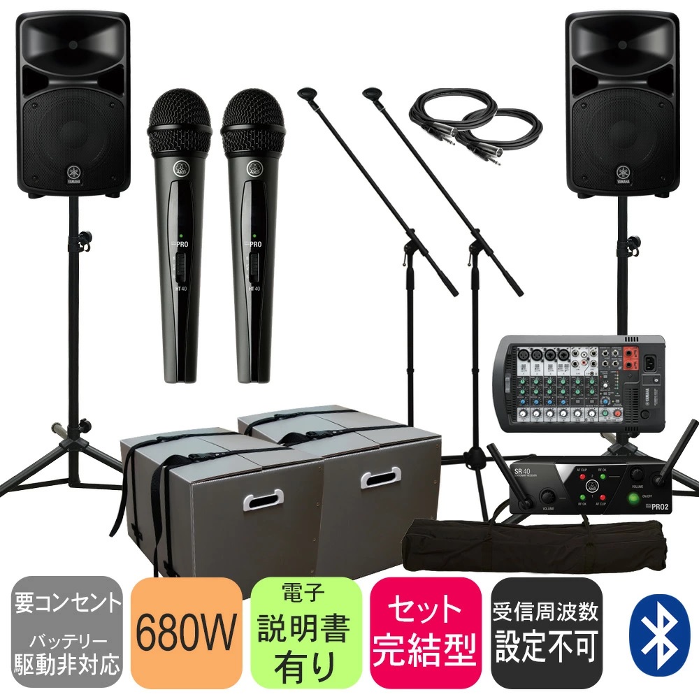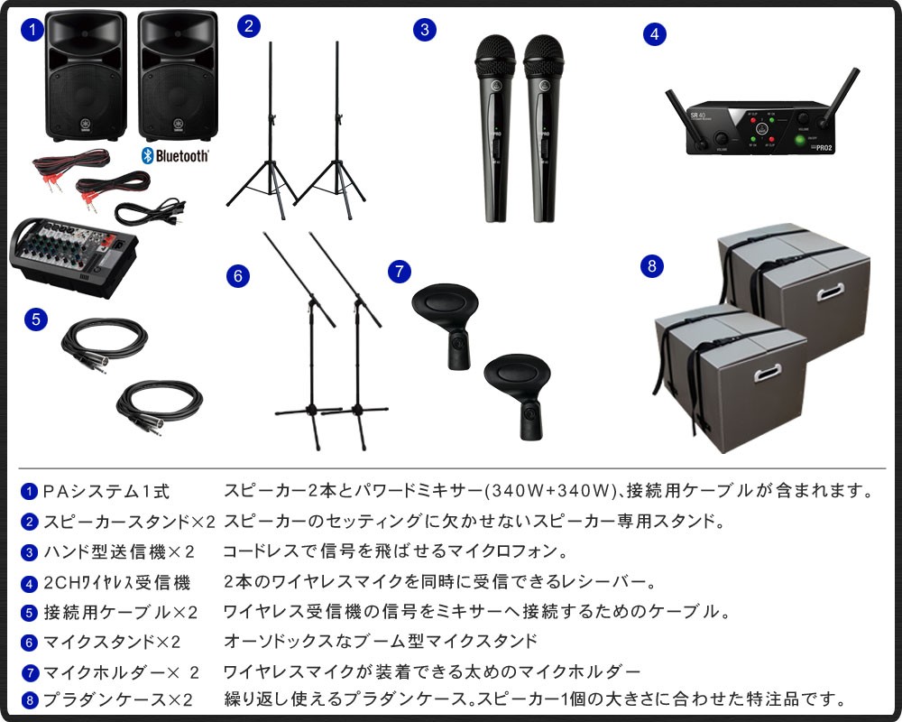 | Q.有線マイクは何本まで接続できますか? A.ワイヤレスマイク使用時は、追加で2本の有線マイクを接続することができます。接続ケーブルはXLRキャノンタイプをご利用ください。入力数が不足する場合は別途ミキサーをご利用頂くことで対応することもできます。 Q.電池またはバッテリーで使用することはできますか? A.当セットは電池駆動に対応していません。AC 電源でお使いください。電池駆動可能なスピーカーのお取り扱いもございますので、お求めの方は当社のPAセットページをご覧頂けましたら幸いです。 Q.セットのほかに必要なものはありますか? A.当セットの内容物のみで音は出力できますが、必要に応じてマイクやケーブルをご用意下さい。 | ||||||||||||||||||||||