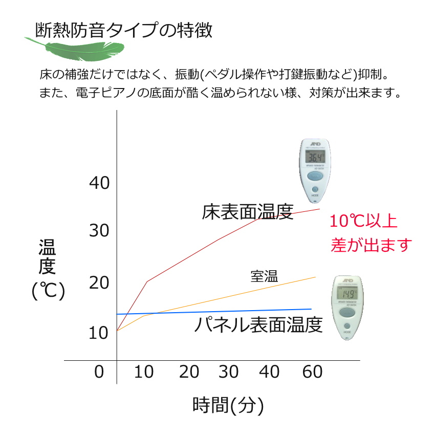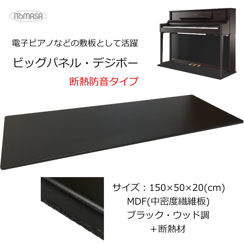 | 本商品は、ピアノ設置時に利用される人気の床補強ボード「ビッグパネル」のシリーズで、電子ピアノのサイズに丁度良いボードとして発売されております。 素材はMDF(中密度繊維板)で比重が重たく強いボードですので、テレビ台の下などにもご使用いただく例がございます。 ピアノ用の補強ボードは、本商品を発売しているイトマサやフラットボードを発売している吉澤など現在様々なメーカーが同等のボードを発売致しておりますが、電子ピアノ対応のサイズは珍しいです。 補強ボードは、「上からの重量による設置面(床や畳)のダメージを軽減すること」が第一目的ですが、本商品は床に接触する面(ボードの下側)に断熱素材を採用することで、断熱防音の対策にもご使用いただけるタイプとなっております。 通常タイプと断熱防音タイプを用途に応じてお選び頂ければ幸いです。 なお、設置作業に関しましては、当店で請け負うことはできませんので、予めご了承ください。 | ||||||||||||||