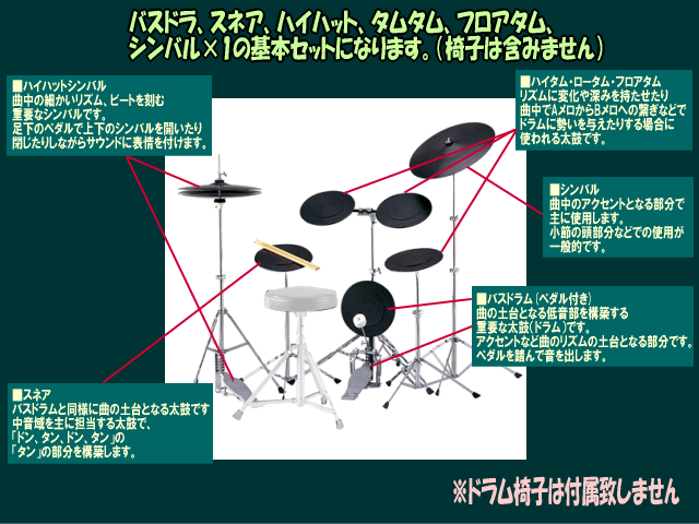 ■セット内容:バスドラパッド、キックペダル、ハイハットシンバルパッド(上下)、スネアパッド、ハイタムパッド、ロータムパッド、フロアタムパッド、シンバル×1、各々のスタンド類、スティック1ペア