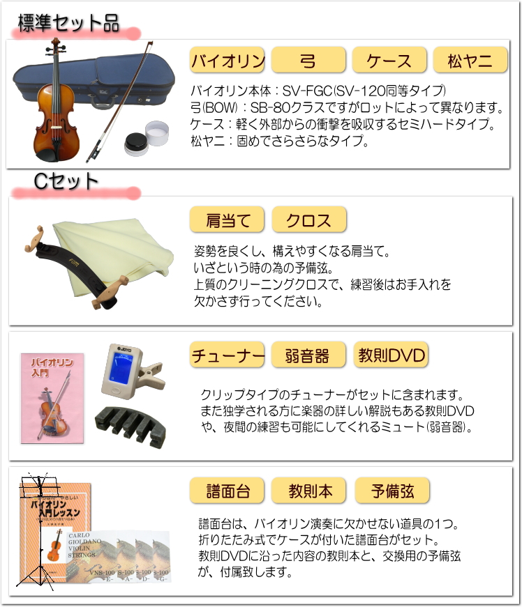 | ※本商品は大人サイズといわれている4/4サイズのバイオリンです。ほかのサイズは発売しておりません。お子様用にはSV180BCなどをご検討ください。 | ||||||||||||