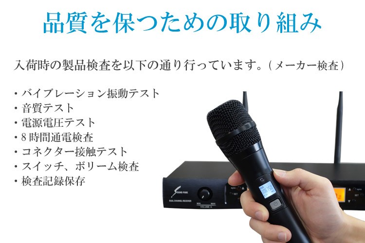 当商品は、既にSOUND PURE8000チューナーをお持ちの方で、破損してしまったときの予備や、買い替えなどに適しているワイヤレス送信機単品販売となります。ワイヤレスマイクもお手頃価格で単品購入できるのもSOUND PUREの強みです。 当商品は、会議からカラオケ、トークイベントやライブといった幅広い用途にお勧めのオールマイティーなワイヤレスマイクロフォン。お値段もリーズナブルで気兼ねなく使用できるのが特長です。指向性はやや広めとなっており、マイキングテクニックを気にしなくても、どなたでもそつなくお使い頂ける機種です。 ※ワイヤレス受信機をお持ちでない方は、送受信機のセット品をご利用下さい。