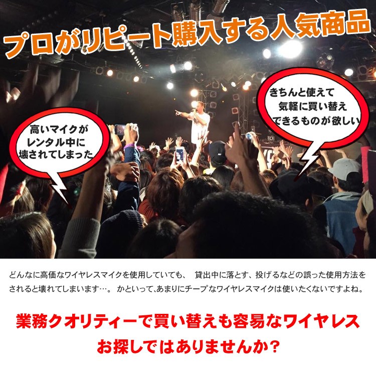 当製品は、周波数の可変が可能なB帯ワイヤレスです。周囲にワイヤレスマイクが運用されていない場面でしたら、計算上は最大で6本のワイヤレスマイクを運用することができます。