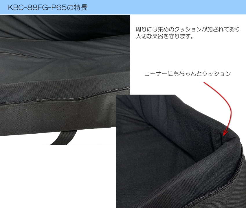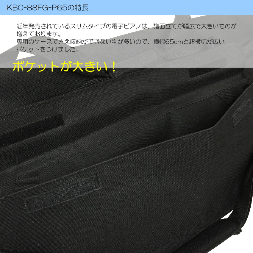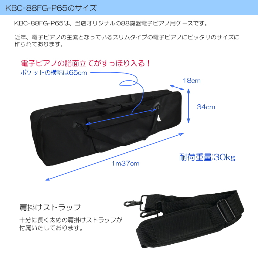 | 当店オリジナルケース。 YAMAHA、Roland、KORG、CASIOなどから発売されているスリムタイプの88鍵盤電子ピアノに丁度良いサイズのケースです。 内側には厚み1cmの分厚いクッションが施されていて、楽器を衝撃から守ります。 また、手持ちの他に肩掛けストラップも付属していて持ち運びが楽々。 さらに、この度、改良された点と致しまして 最近の電子ピアノに多い横の幅が広い譜面立てが収納できるよう、外ポケットがかなり大きくなりました。 横幅は65cmございます。 商品の仕様情報に譜面立てのサイズが明記されていない場合が多いので、譜面立てが収納可能な機種を明確にご紹介することはできませんが、流通している大半の電子ピアノの譜面立てが収納できます。 汎用タイプで、幅65cm以上の幅のポケットを装備したソフトケースを他で見たことがありません。 耐荷重量は30Kgです。 2021年4月現在流通している各社メーカーの電子ピアノで本体が収納いただける機種をご紹介いたします。 ■ヤマハ(YAMAHA):P-125 ■ローランド(Roland):FP-10、FP-30、FP-60、RD-88、FP-30X、FP-60X ■コルグ(KORG):B2N、B2-BK、B2-WH、D1 ■カシオ(CASIO):PX-S1000、PX-S3000、PX-5S、CDP-S150 ■アルテシア(Artesia):Performer、PA-88H+ などです。 ※汎用ケースですので、少し大きさに余裕をもって作っております。 上記ご紹介機種は当店で実際に収納して確認いたしましたが、RD-88の様にボディの方が小さくてケース内にゆとり(あそび)ができてしまう場合がございます。予めご了承ください。 ※ご注文まえに、必ずお手持ちの電子ピアノのサイズをご確認いただき、収納可否に関しましてはお客様のご判断でお願いいたします。 「サイズが合わなかった。」などの理由での返品は受付いたしておりませんので、ご注意ください。 |