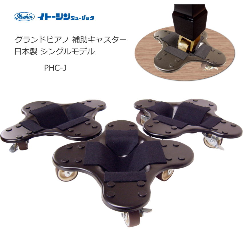 最初はドイツ製の補助キャスターしかなかったのですが、現在はピアノ付属品メーカーの甲南やイトーシンミュージックなどいくつかのメーカーからグランドピアノ用の補助キャスターが発売されております。
