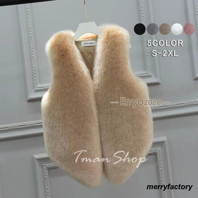 ファーベスト レディース ショート丈 ノースリー 冬ベストブ ボリュームファー ウサギフェイクファー Vネック 毛皮ベスト モコモコ アウター 冬新作
