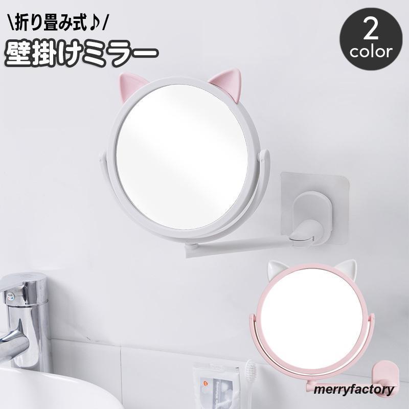 壁掛け鏡 ウォールミラー 可動式 折り畳み スイングミラー アームミラー ネコ 猫耳 丸型 ラウンド インテリア 収納 日用品雑貨 おしゃれ かわいい
