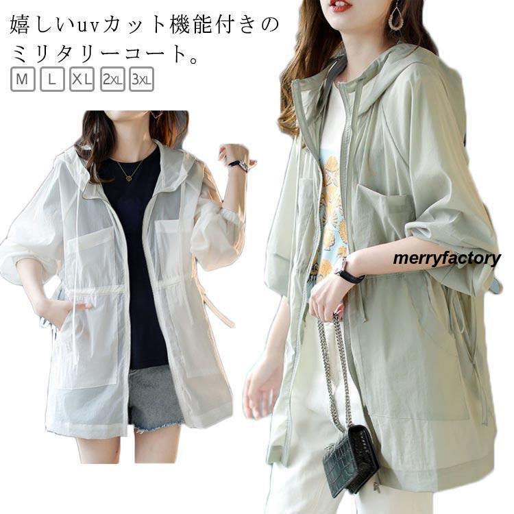 uvカット パーカー レディース 薄手 アウター ミリタリー コート フード付き ブルゾン ジャケット 羽織り カーディガン 長袖 ポケット付き 春