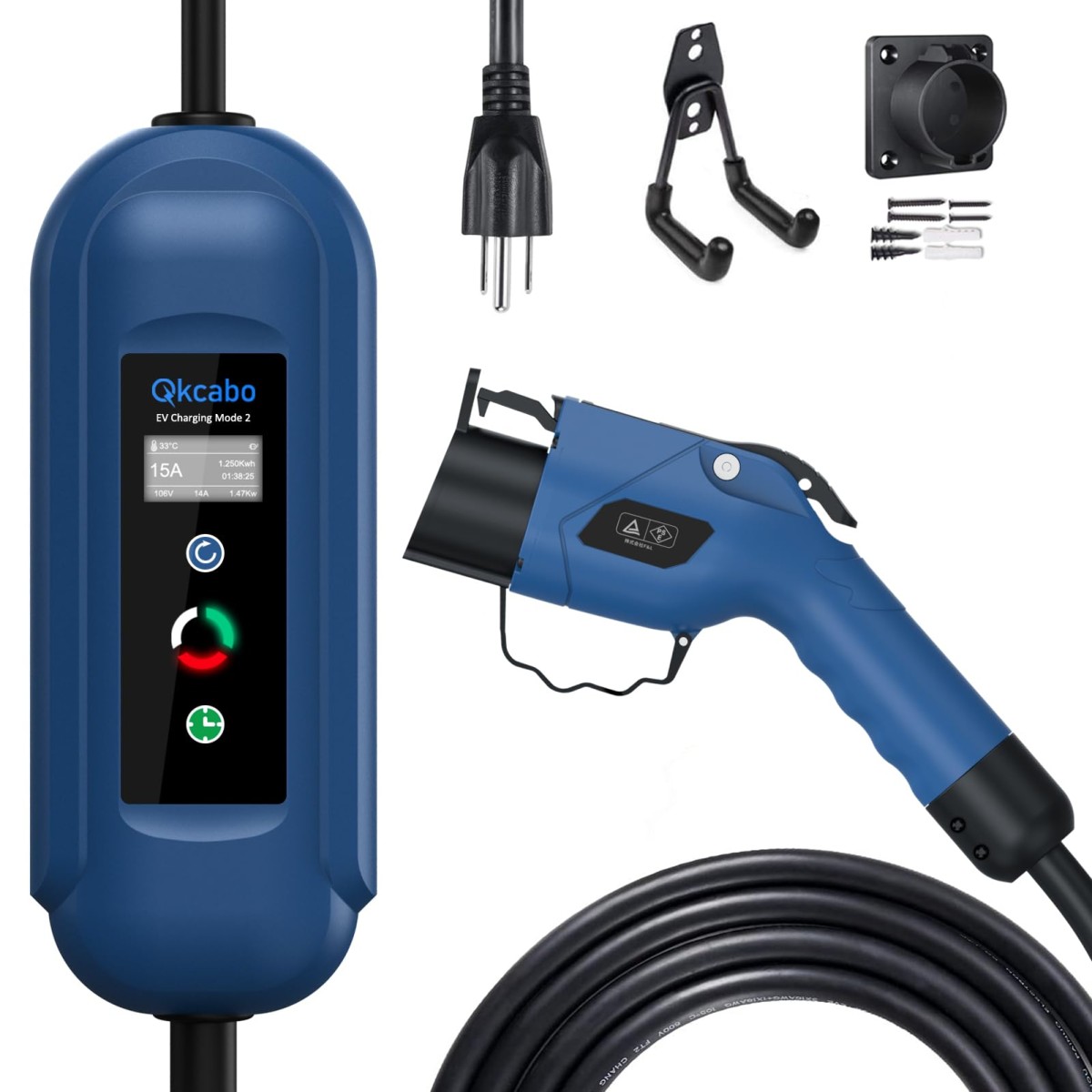 Qkcabo 1.6KW 電気自動車 充電ケーブル EV充電器 100V-125V、8A/10A/13A/15A 電流調整可能の家庭用自動車充電ガンSAE J1772急速PHEV/EV 充電ケーブル付き、電気