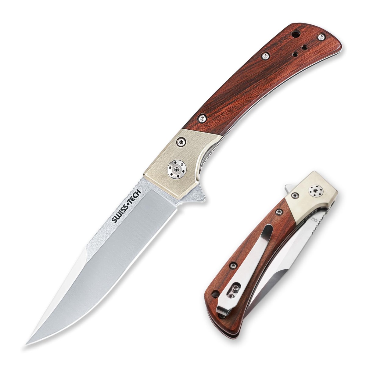 SWISS+TECH フォールディングナイフ アウトドアナイフ 折りたたみ式 D2鋼 ブレード 木製ハンドル 釣り キャンプ コレクション プレゼント 鑑賞用 滑り止め