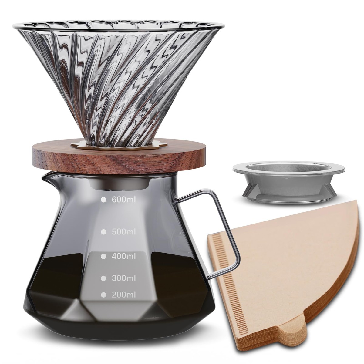 【完璧な組み合わせ】: この コーヒードリップセット は耐熱ガラス、クルミ材、シリコンで構成されています。