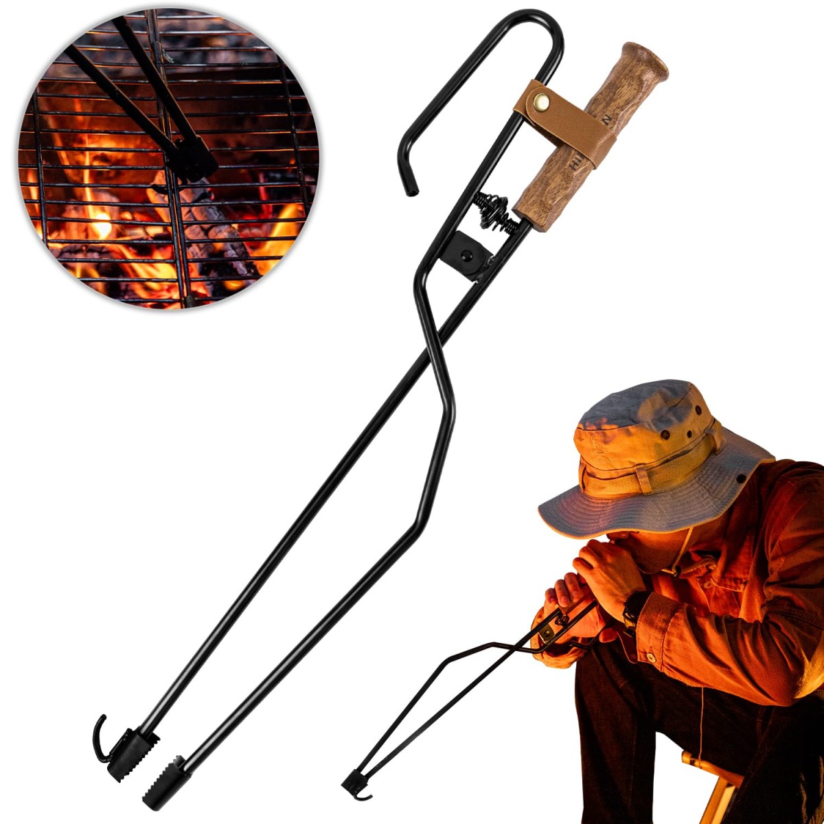 「3in1多機能の火バサミ」:??「トング」、「火吹き棒」、「リフター機能」を一つに融合し、薪を挟むのは勿論、?? 火吹き棒一体型で態々紛失しやすい火吹き棒を苦労して探すことなく、すぐ焚き火の火力調整がしやすくなる??先端のフックはリフター機能として加熱された蓋を取り上げる際にも火傷の心配無しで便利です。