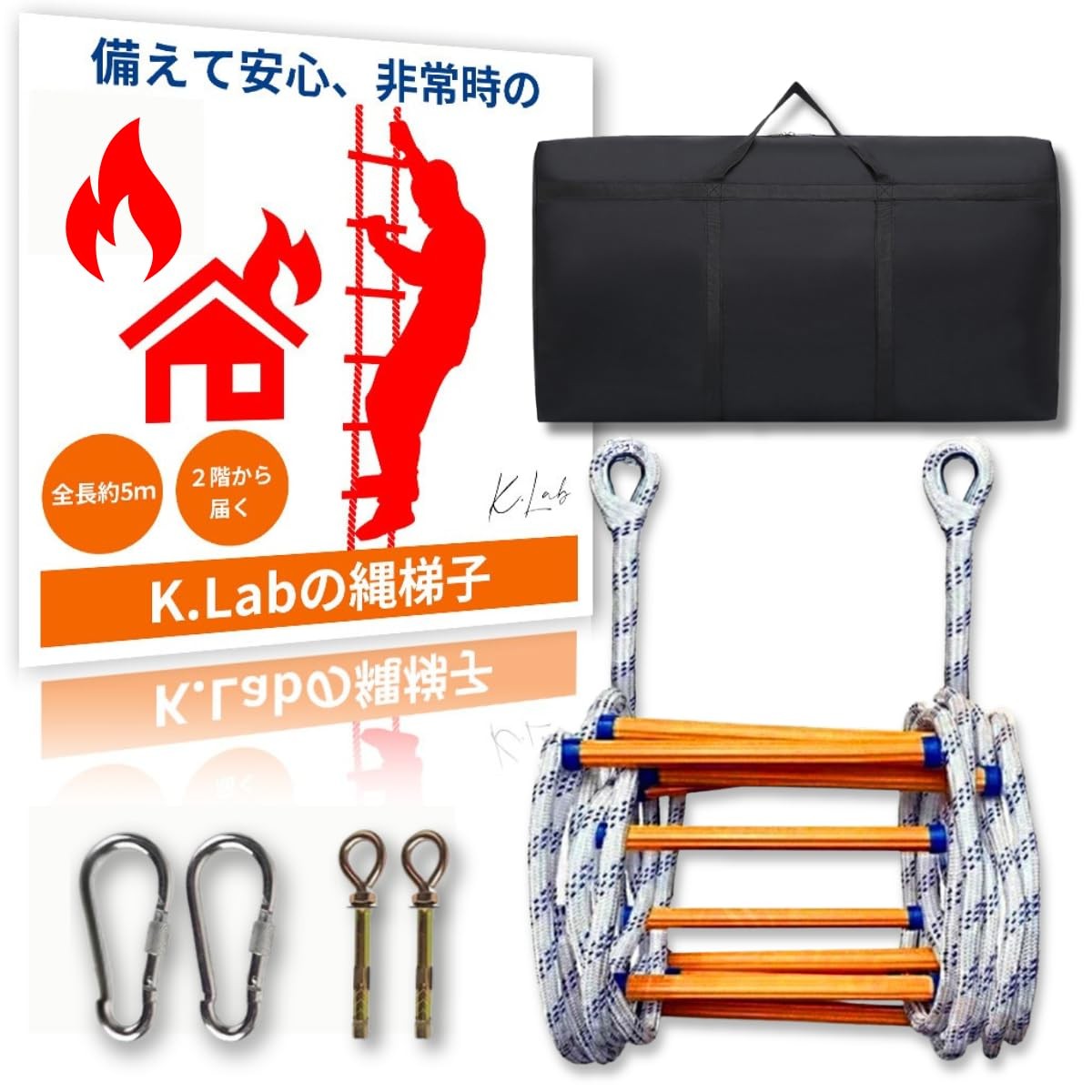【K.Lab】 縄梯子 全長5mで2階からも届く 防災はしご 避難ロープ 避難用はしご 防水収納袋 カラナビ アンカーボルト 付属 防災 安全避難用 緊急用 コンパクト