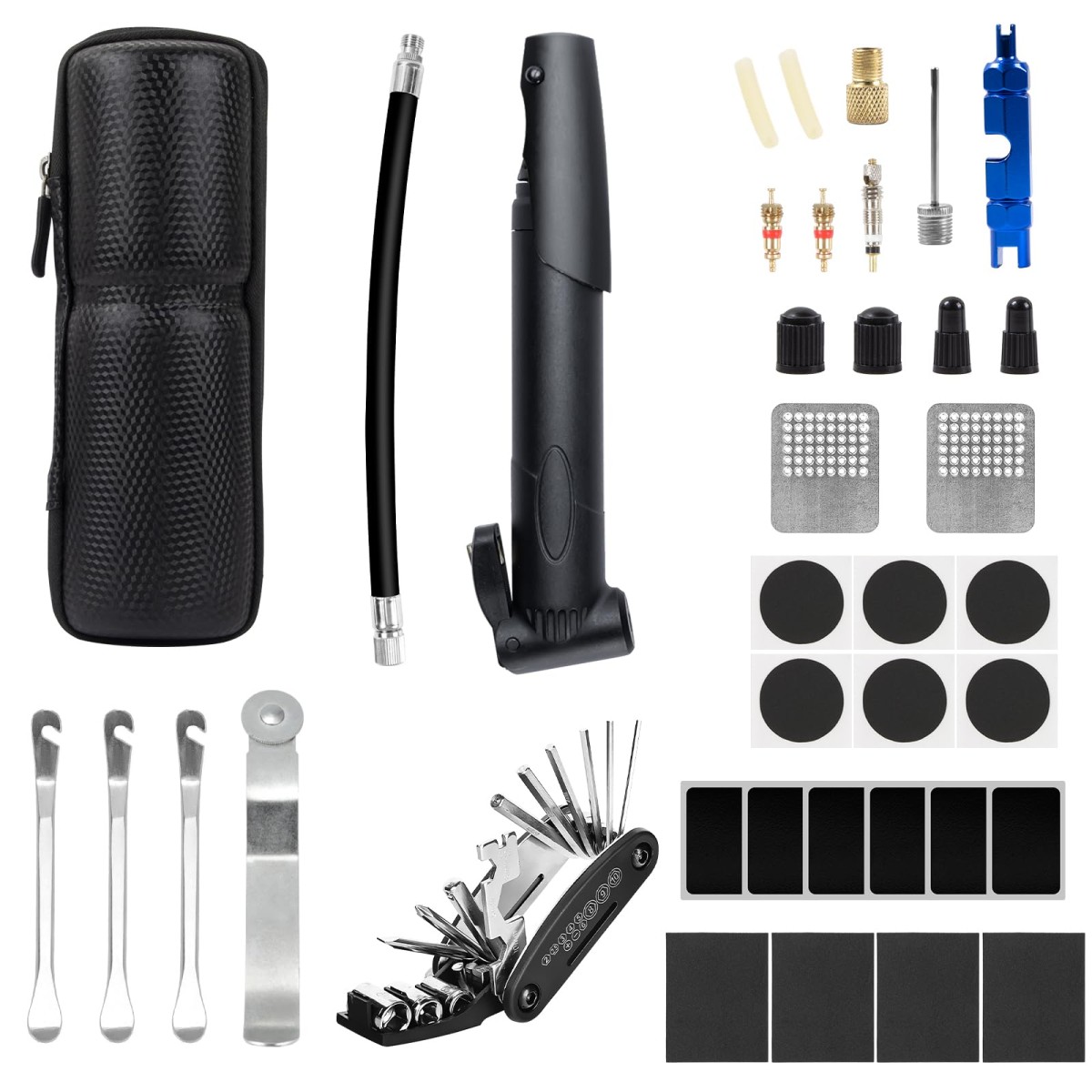 【2025新登場充実の自転車パンク修理キット】パンク修理キット、空気入れセット、16-in-1マルチツール、円筒型収納バッグ、バルブセット、合計38点が含まれています。