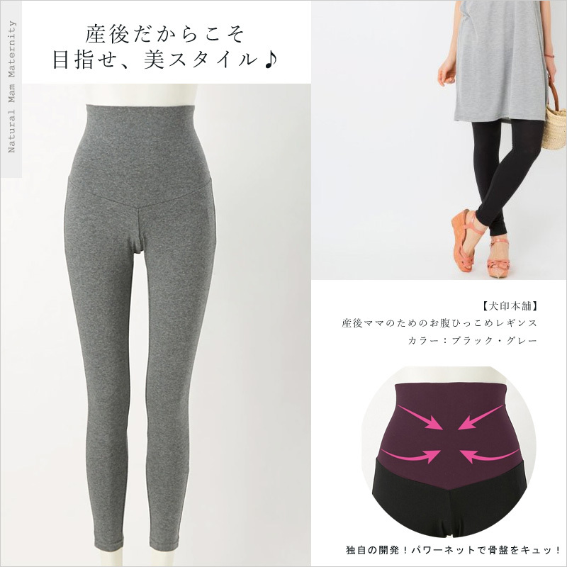 マタニティの老舗「犬印本舗」とママが共同開発。産後のママのためのお腹ひっこめレギンスです。