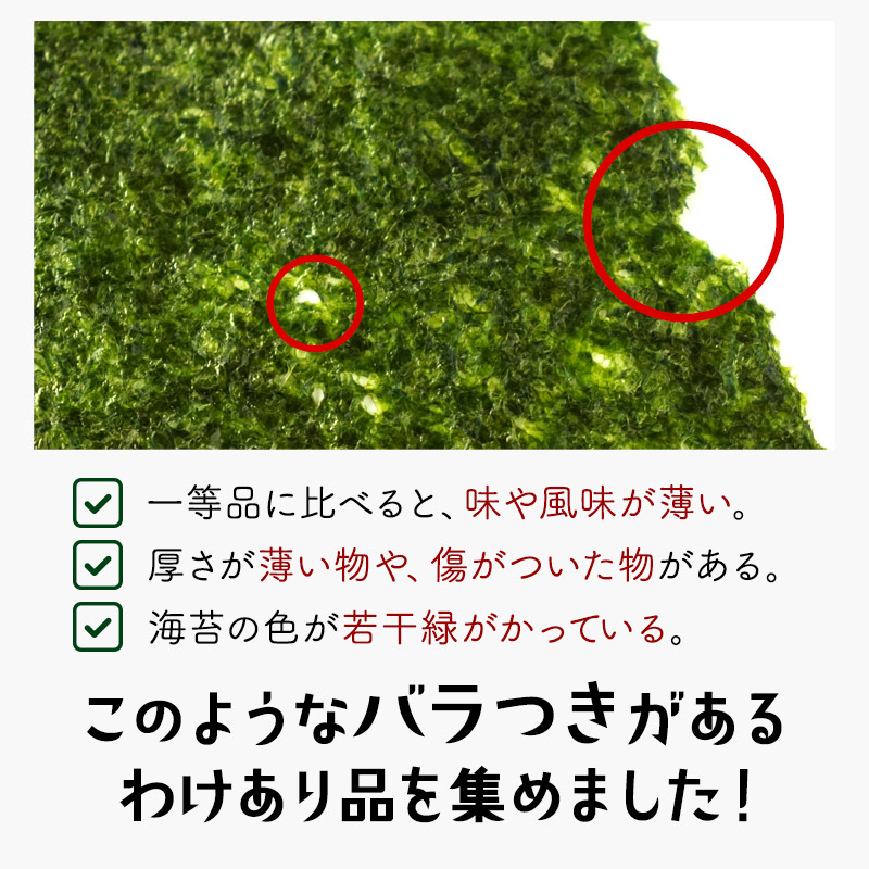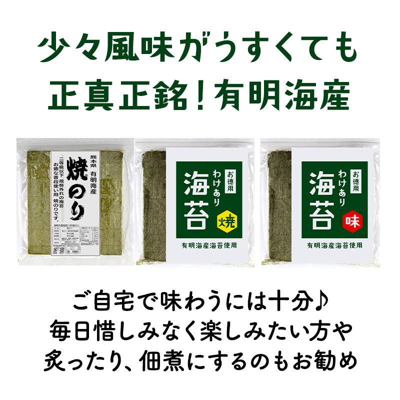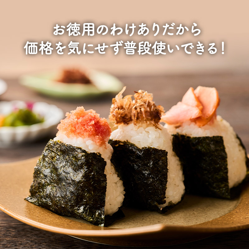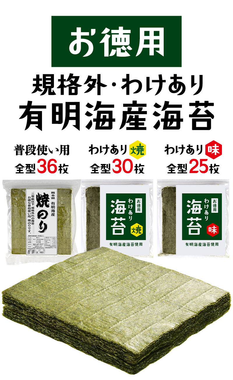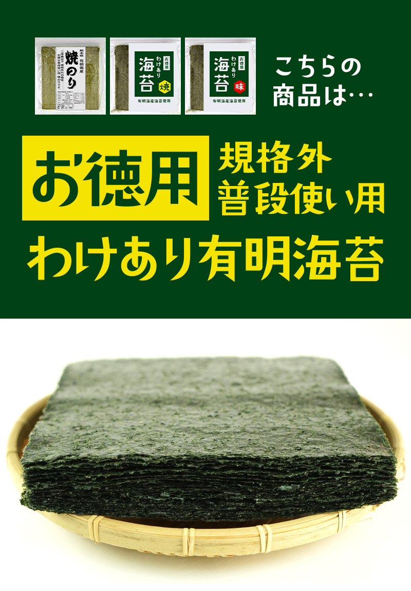| 【商品名】 有明海産 海苔 お徳用 わけあり [焼き海苔3種 味付け海苔2種] 5種 選り取り 【商品紹介】 日本屈指の海苔生産地有明海は、福岡県・佐賀県・長崎県・熊本県の九州最大の湾です。有明海は穏やかな海ではありますが、激しい寒暖差・干満差があり、多くの河川から豊かな大地の栄養分が運ばれる海苔の生育に適した海なのです。 今回ご案内の訳あり規格外有明海産海苔は一等品に比べると、味や風味が薄く、色も若干緑がかっています。また、キズがあったり、厚みが薄かったりする物が含まれるため『訳あり品』なんです。 少々風味が薄くても有明産、ご自宅で味わうには十分♪炙ったり、佃煮にするのもお勧めの有明海苔を、どっさりパックでお届けします!! ■選べるパターンは5種類! ・普段使い用焼のり 全型36枚 ・お徳用 わけあり海苔(焼) 全型30枚 ・お徳用 わけあり海苔(味) 全型25枚 ・上級有明海産 焼き海苔 全型15枚 ・規格外有明海産 味付海苔 三つ切60枚(全型20枚) 【原材料】 焼海苔:乾のり(有明海産) 味付海苔:乾のり(有明海産)、昆布・煮干・海老・醤油・砂糖・塩・みりん(一部に海老・大豆・小麦を含む)、調味料(アミノ酸等)、ソルビット・甘味料(甘草) 【内容量】 ・普段使い用焼のり 全型36枚 ・お徳用 わけあり海苔(焼) 全型30枚 ・お徳用 わけあり海苔(味) 全型25枚 ・上級有明海産 焼き海苔 全型15枚 ・規格外有明海産 味付海苔 三つ切60枚(全型20枚) 【原産国】 日本 【保存方法】 直射日光・高温多湿な場所を避けて保存して下さい。 また開封後はお早めにご使用下さい。 【販売者】 阪神酒販株式会社 兵庫県神戸市兵庫区吉田町2-13-6 |