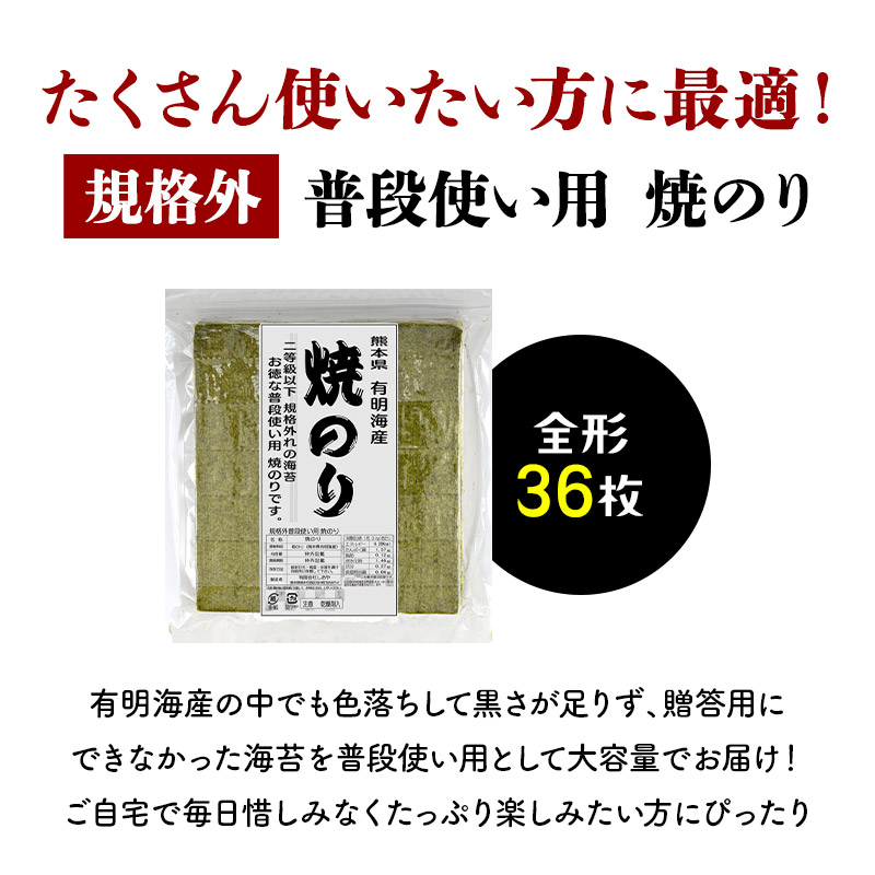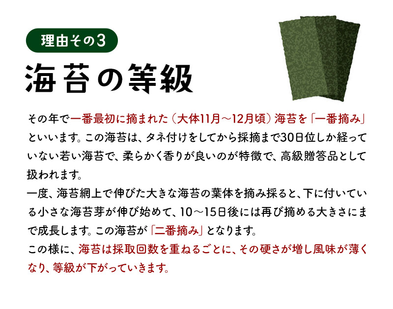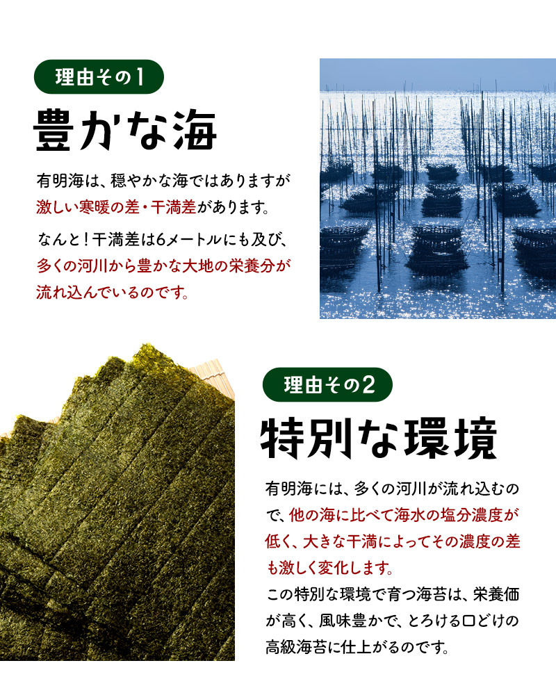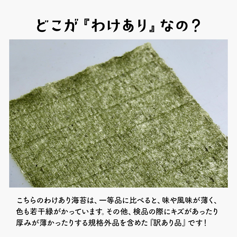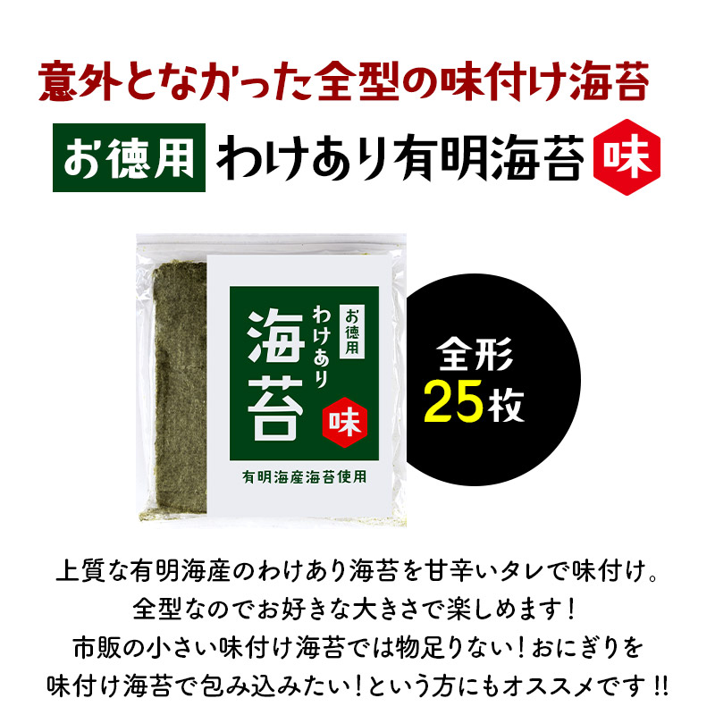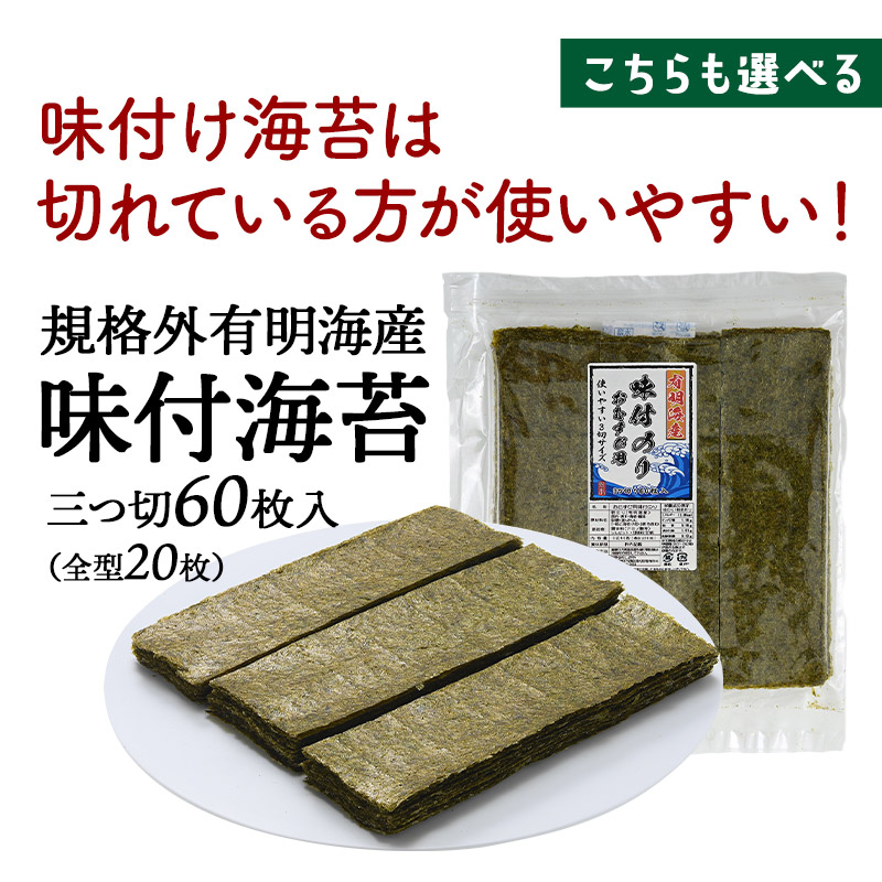 | 【商品名】 有明海産 海苔 お徳用 わけあり [焼き海苔3種 味付け海苔2種] 5種 選り取り 【商品紹介】 日本屈指の海苔生産地有明海は、福岡県・佐賀県・長崎県・熊本県の九州最大の湾です。有明海は穏やかな海ではありますが、激しい寒暖差・干満差があり、多くの河川から豊かな大地の栄養分が運ばれる海苔の生育に適した海なのです。 今回ご案内の訳あり規格外有明海産海苔は一等品に比べると、味や風味が薄く、色も若干緑がかっています。また、キズがあったり、厚みが薄かったりする物が含まれるため『訳あり品』なんです。 少々風味が薄くても有明産、ご自宅で味わうには十分♪炙ったり、佃煮にするのもお勧めの有明海苔を、どっさりパックでお届けします!! ■選べるパターンは5種類! ・普段使い用焼のり 全型36枚 ・お徳用 わけあり海苔(焼) 全型30枚 ・お徳用 わけあり海苔(味) 全型25枚 ・上級有明海産 焼き海苔 全型15枚 ・規格外有明海産 味付海苔 三つ切60枚(全型20枚) 【原材料】 焼海苔:乾のり(有明海産) 味付海苔:乾のり(有明海産)、昆布・煮干・海老・醤油・砂糖・塩・みりん(一部に海老・大豆・小麦を含む)、調味料(アミノ酸等)、ソルビット・甘味料(甘草) 【内容量】 ・普段使い用焼のり 全型36枚 ・お徳用 わけあり海苔(焼) 全型30枚 ・お徳用 わけあり海苔(味) 全型25枚 ・上級有明海産 焼き海苔 全型15枚 ・規格外有明海産 味付海苔 三つ切60枚(全型20枚) 【原産国】 日本 【保存方法】 直射日光・高温多湿な場所を避けて保存して下さい。 また開封後はお早めにご使用下さい。 【販売者】 阪神酒販株式会社 兵庫県神戸市兵庫区吉田町2-13-6 |
