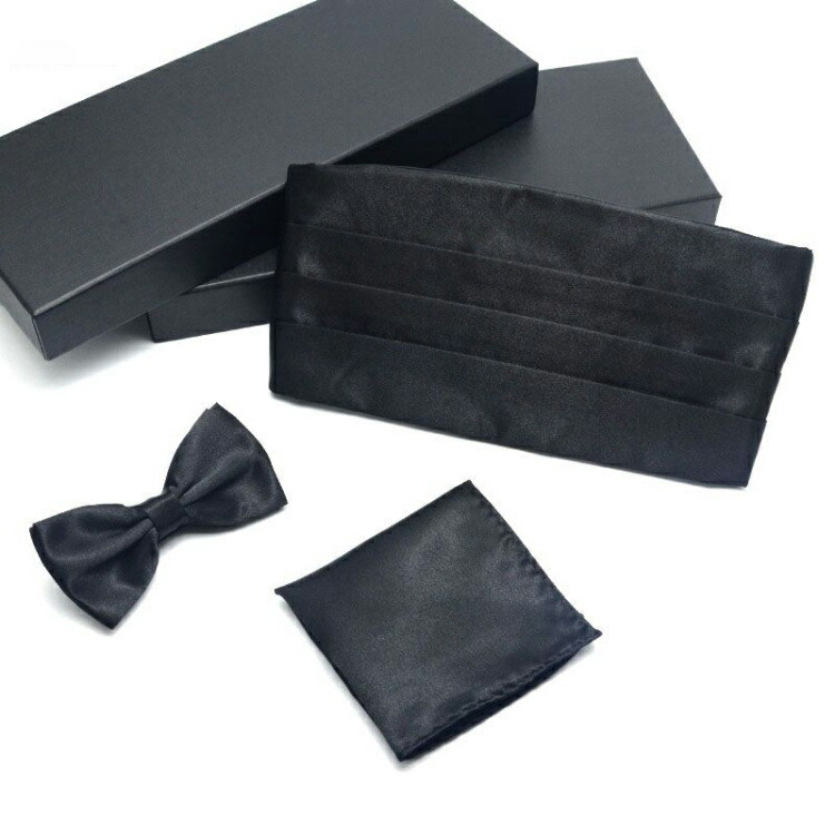 【3点セット】タキシード用 メンズ 紳士 礼服用 カマーバンド サテン製 光沢 ブラック シルクタッチ 蝶ネクタイ ポケットチーフ 結婚式 成人式 クリスマス ギフト フォーマル
