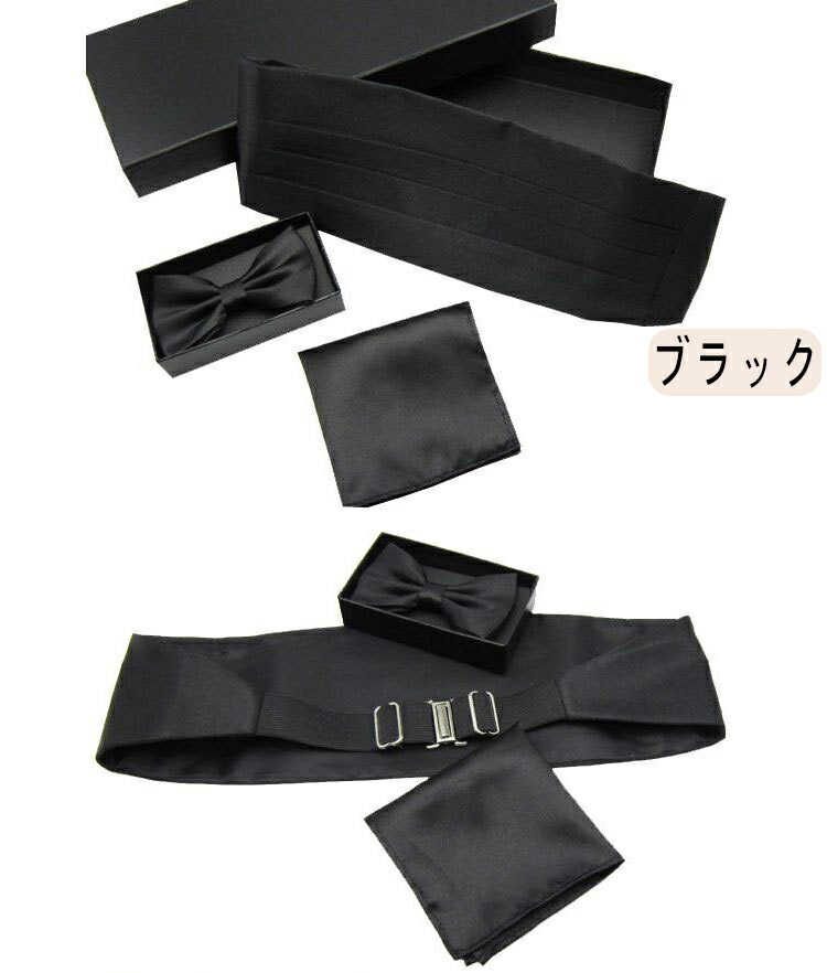【3点セット】タキシード用 メンズ 紳士 礼服用 カマーバンド サテン製 光沢 ブラック シルクタッチ 蝶ネクタイ ポケットチーフ 結婚式 成人式 フォーマル