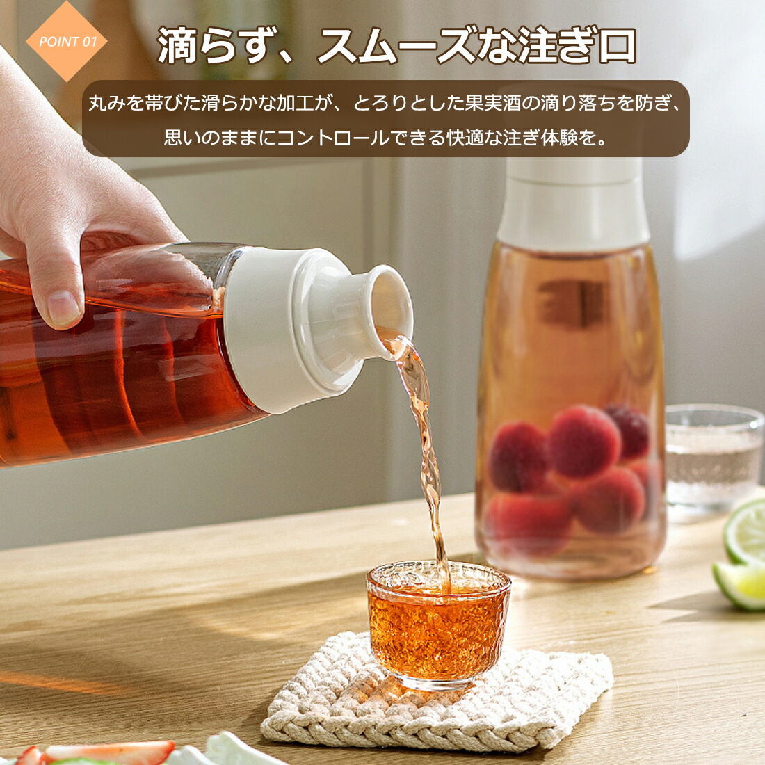 使いやすさを追求した円潤デザイン 円潤な大開口設計により、材料の出し入れや洗浄が簡単に行えます。注ぎ口は液だれしにくい構造となっており、梅酒を注ぐ際の液だれを防ぎ、清潔に作業を進めることができます。?