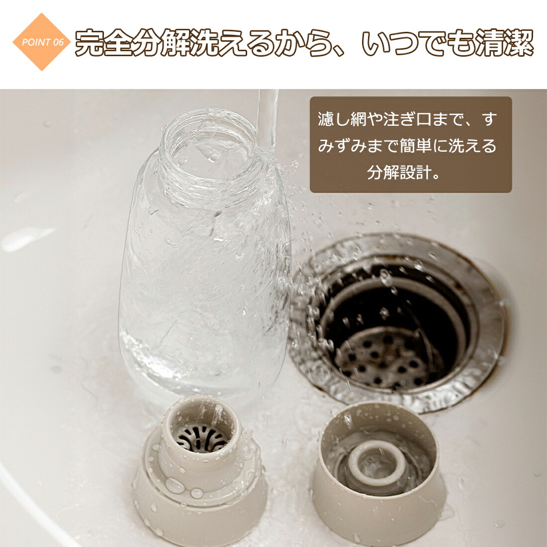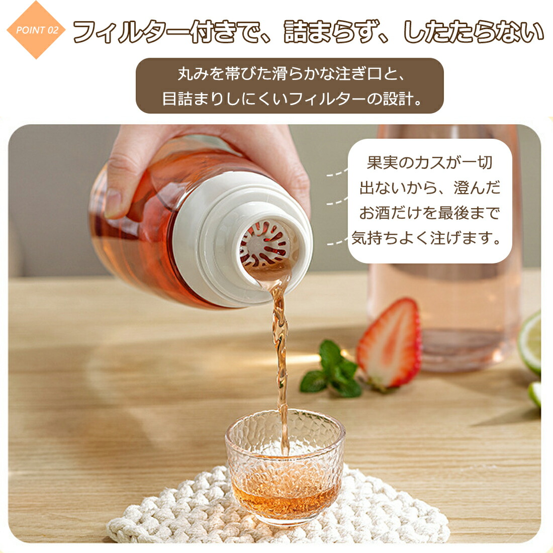 ストレーナー付きで機能性を高めた一蓋両用 内蔵ストレーナーが搭載され、果実酒を注ぐ際に果肉や種を分離して詰まりを防ぎます。さらに蓋は一蓋両用の構造で、倒置するとネジ蓋が漏斗に変身し、片手でも簡単に分注作業を行うことが可能です。