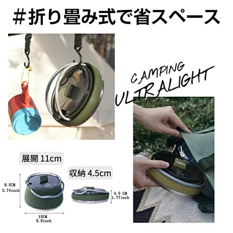 折り畳みケトル トラベルケトル やかん ポット アウトドア調理器具 キャンプ 旅行用 シリコン 湯沸かし器 直火可 ポータブル 折りたたみ式 省スペース 軽量