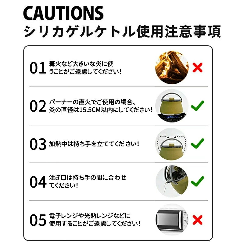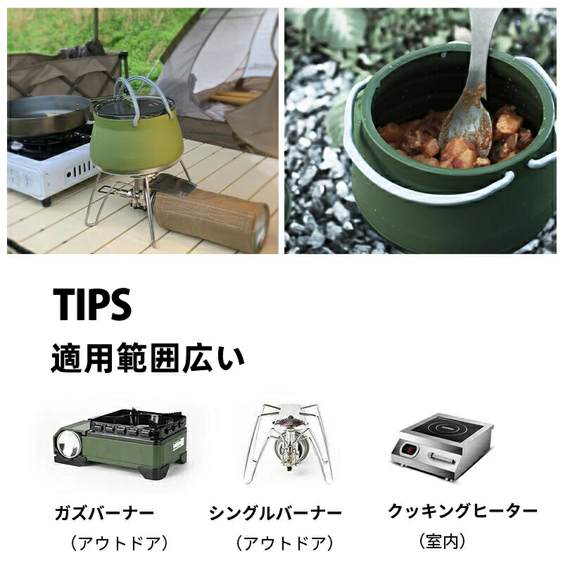 安全な食品グレードのシリコーン素材でできており.臭いがなく.表面がべたつかず.お手入れがとても簡単です.水.お茶.コーヒーを入れたり加熱したりするだけでなく.料理にも使用できます.耐熱ステンレスベースは.キャンプ用コンロやコンロに直接置くことができます.電気ストーブ.キャンプ用ガスタンク.キッチン用ガスストーブなどにご使用ください.折りたたみ可能なコンパクトなデザインで.持ち運びが簡単で.キャンプ.ハイキング.トラベルパックの荷物のスペースを節約できます.