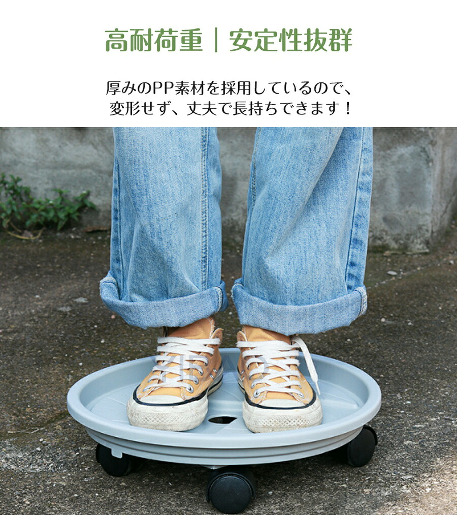 植物を移動したい時や、掃除の時にも便利に使用できます。強度のある台で、大きな鉢でも安定して置くことができます。大きめの鉢を乗せて使用することで重たい植物も楽に移動させることができます。庭やベランダ、室内など様々な場所で活躍します。
