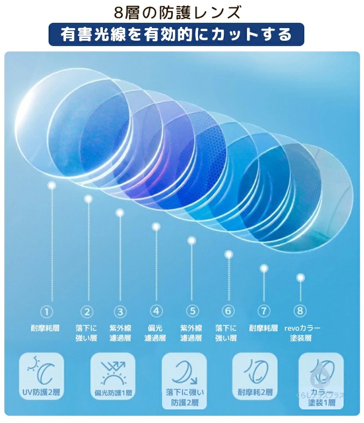 TAC偏光レンズとTR90フレームを採用し、目をしっかりと守り、眩しさを効果的に防ぎます。