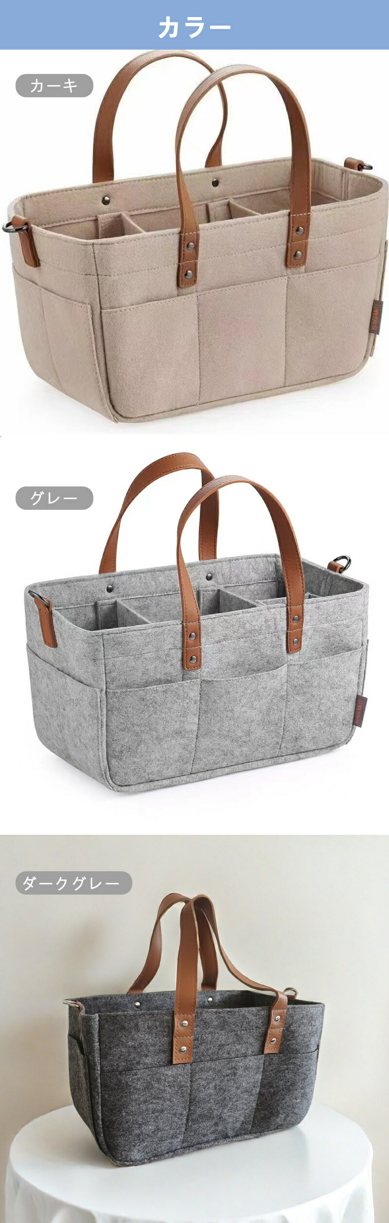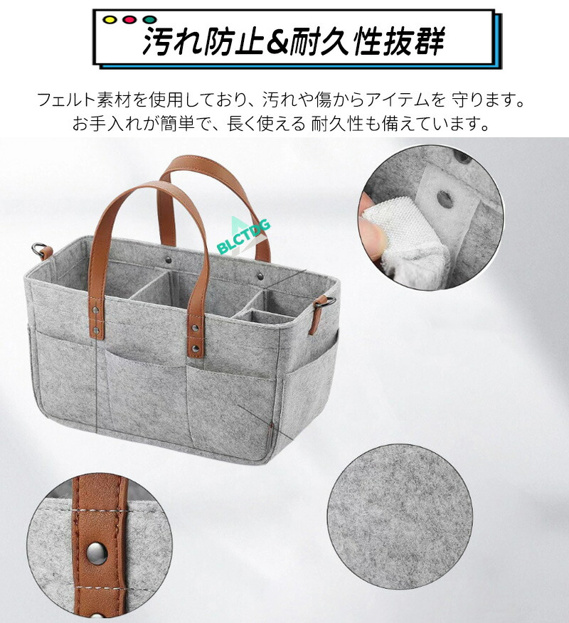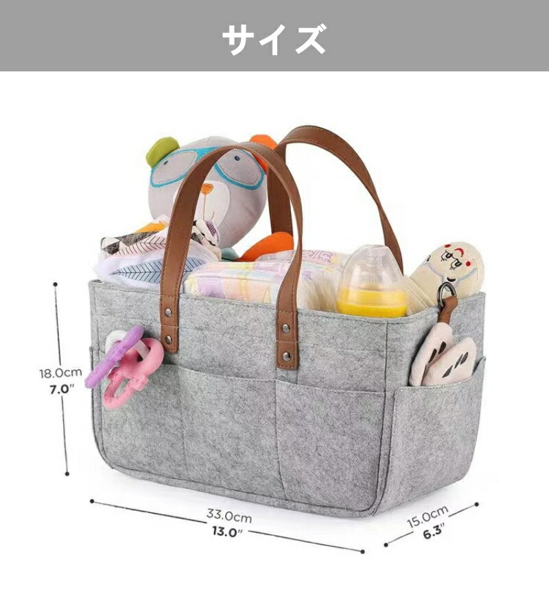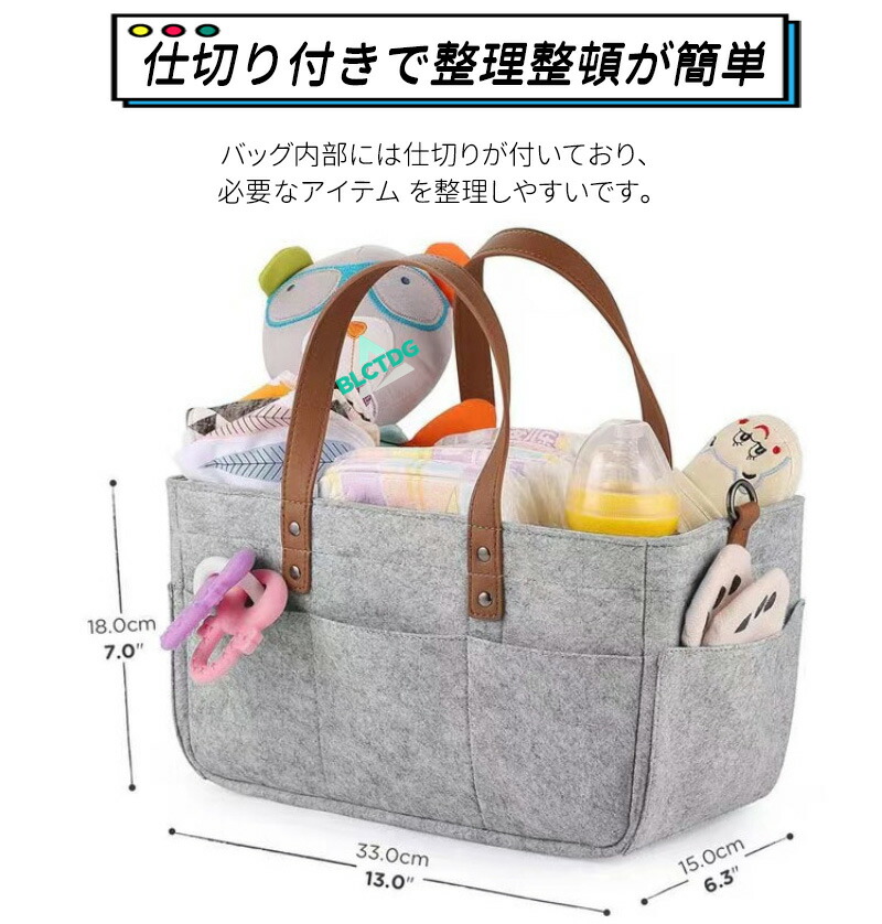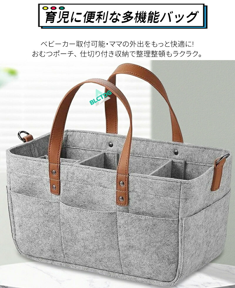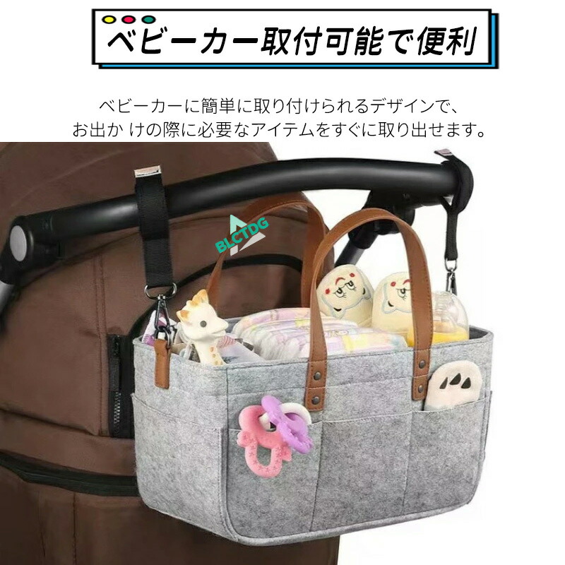 ベビーカーに装着できる多機能フェルトバッグ!ストラップ調節でベビーカーに簡単取付。おむつやおしりふき、着替えなど育児用品をまとめて収納。ママの外出をサポートします。