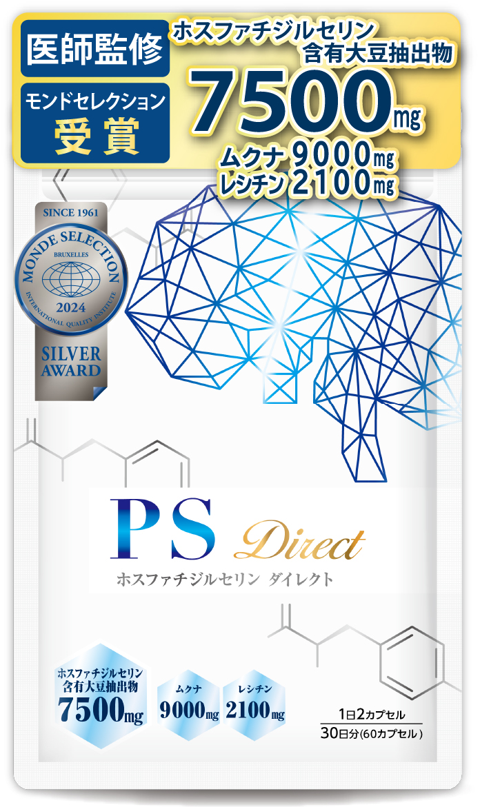 医師監修 ホスファチジルセリン PSサプリ 1袋7500mg 30日分 60粒 1日2粒250mg PSダイレクト 国産無農薬ムクナ レシチン イチョウ葉 GABA DHA 国内製造