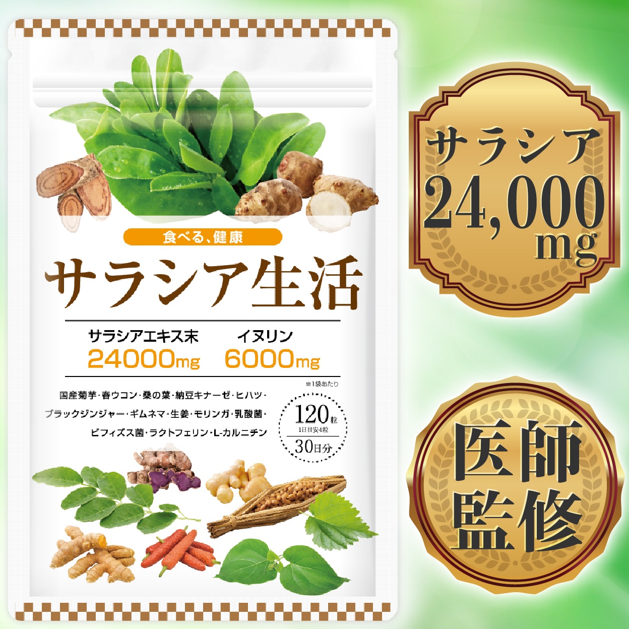 医師監修 サラシア 24000mg イヌリン 6000mg 国産菊芋 桑の葉 16種類の厳選成分 30日分 120粒 GMP国内工場製造 サラシア生活