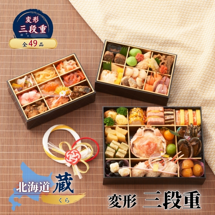 26.帆立チーズソース焼/27.ブロッコリーのバジル和え/28.キャロットラぺ/29.焼とうもろこしのテリーヌ/30.サーモンテリーヌ/31.レモンシロップ漬/32.柿博多/33.蟹のテリーヌ/34.コーンテリーヌ/35.葉わさび松前漬/36.北海道産数の子/37.菜の花のお浸し/38.子持昆布紹興酒漬/39.蟹サラダ甲羅盛り/40.金柑/41.若桃甘露煮/42.田作り/43.刻み昆布/44.鮑旨煮/45.丹波産黒豆/46.百合根甘露煮/47.蟹爪彩り包み/48.栗金団/49.焼栗ブランデー風味(24品)