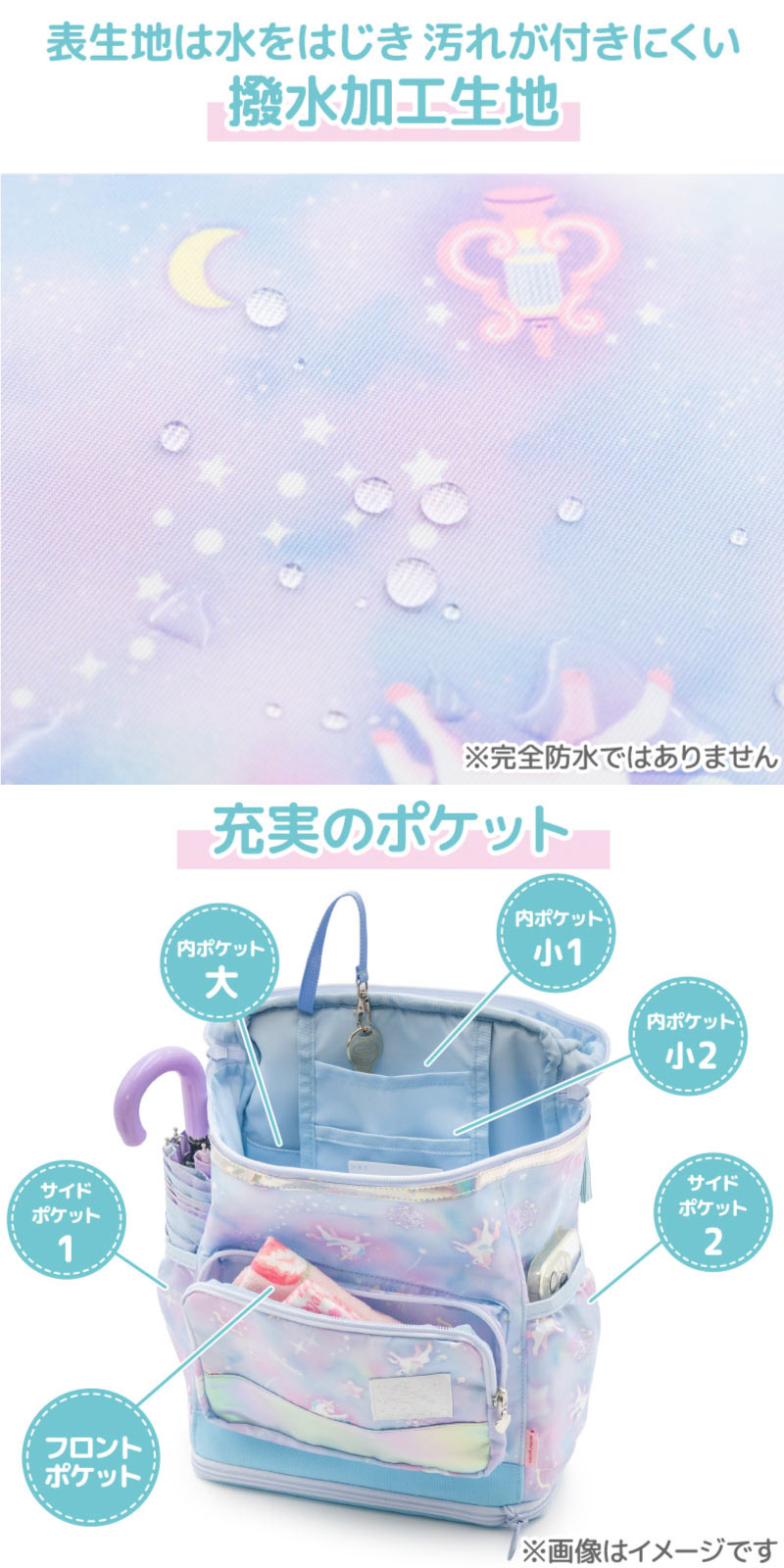 *表生地のみ「撥水加工」を施した生地を使用していますが、防水ではありません。長時間の雨や強い雨にさらされると、生地の縫い目やファスナー部分から浸水する場合があります。