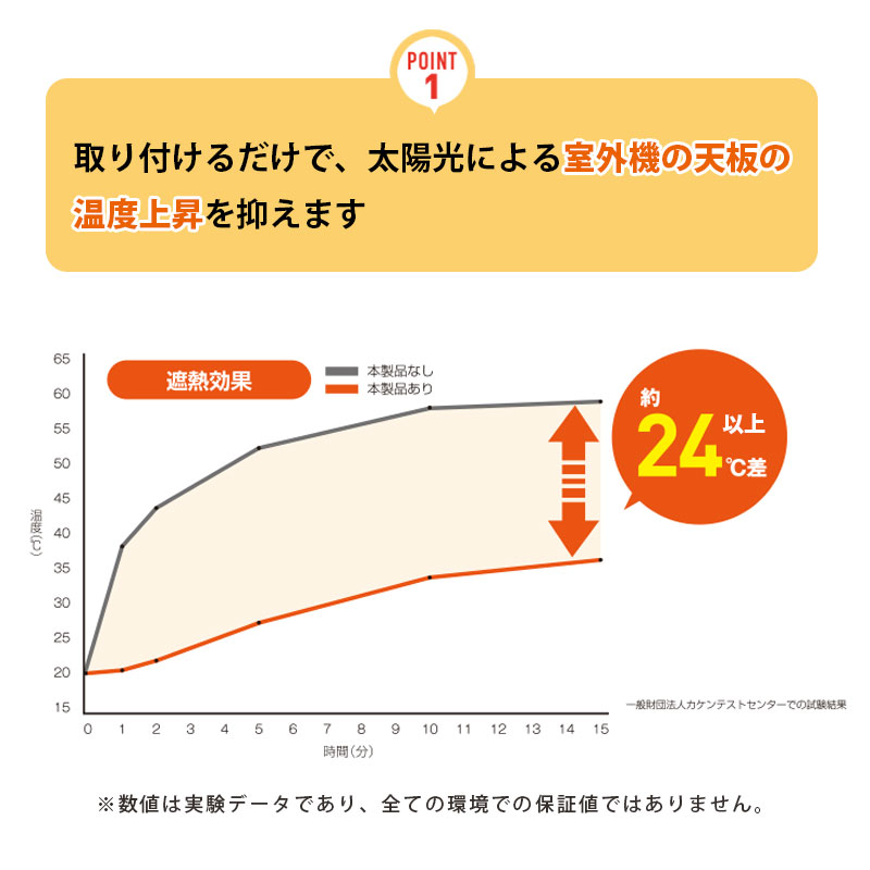 本製品は天板温度の上昇を抑え、最大約28℃の遮熱効果を発揮。室外機の負担を軽減し、冷房効率をサポートします。