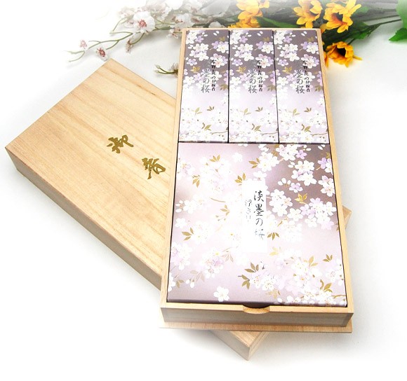 燃焼時間約25分の「淡墨の桜」約60g入りの箱3つです。桜皮ポリフェノール、孟宗竹炭、植物エキス配合。煙極少。