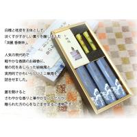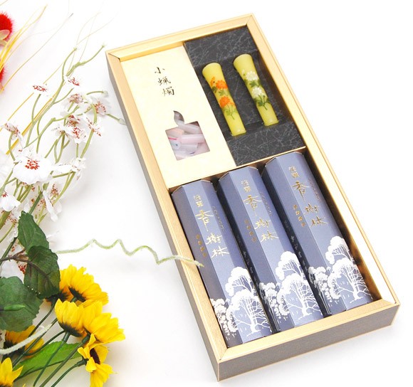 白檀と桂皮を主体として、淡くすがすがしい薫りを醸し出した「淡麗 香樹林」。人気の現代的で軽やかな香調のお線香に、菊の花をあしらった絵蝋燭と、実用的でかわいらしいミニ蝋燭を詰合せました。蓋を開けるとさわやかな香りと華やかないろどりが、贈られた方の心をなごませまるご進物です。