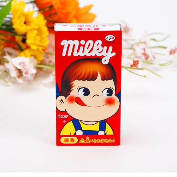 世代を超えて愛されるミルキー。箱はそのまま、中身はもちろん「食べられません」。甘く優しい香りのお線香です。