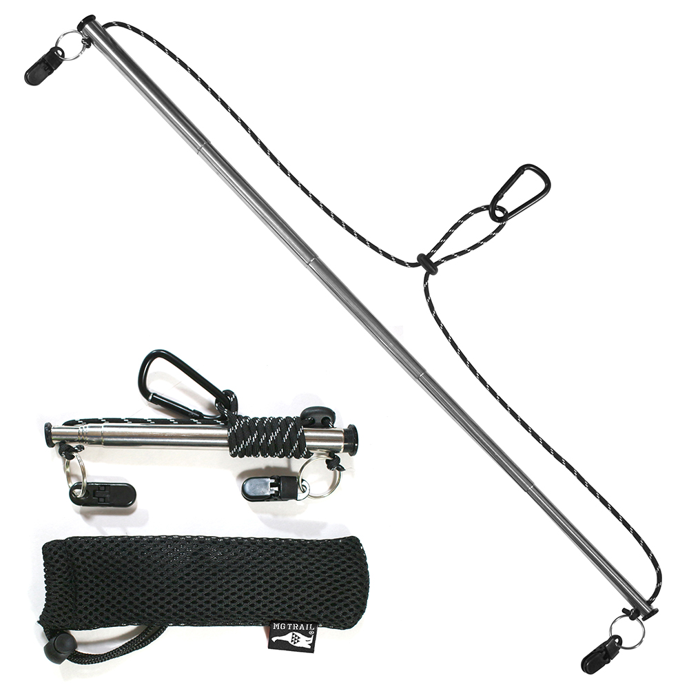 ●専用メッシュケース付き。カラビナ部分を出してリュックなどに引っかけて携帯できます。MG TRAILの雷鳥ロゴタグがワンポイントです。