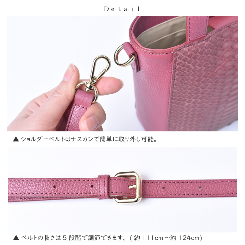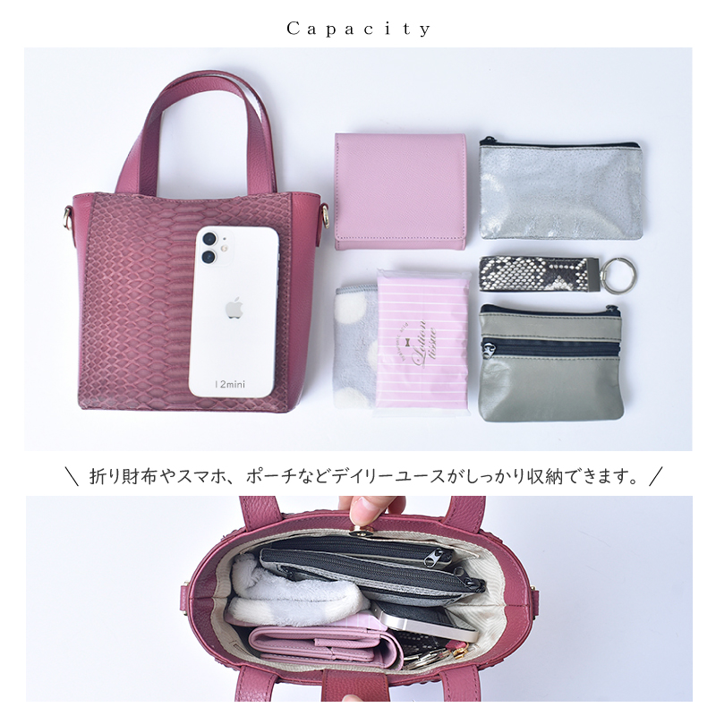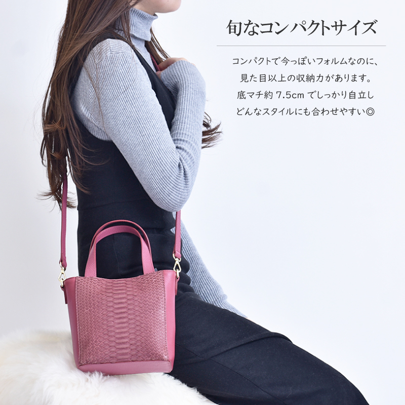 | 特徴 | いつものコーディネートをワンランクアップ! パイソン本革バッグが新登場♪ 「定番デザインに、トレンドのパイソンをプラス」 シンプルなフォルムながらもパイソンがアクセントになり、洗練された印象に。 ベーシックだからこそ素材と柄にこだわりたい。そんな大人女子におすすめです。 「旬なコンパクトサイズ」 コンパクトで今っぽいフォルムなのに、見た目以上の収納力があります。 底マチ約7.5cmでしっかり自立しどんなスタイルにも合わせやすい◎ 「上品なワインカラー」 甘すぎず、落ち着いた色合いが大人の女性の魅力を引き立てます。 カジュアルにもきれいめにも合わせやすい上品なカラーです。 「パイソン本革が持つ、特別な魅力」 パイソン革の最大の特徴は美しく独特な鱗模様です。 鱗の形状や大きさは、同じ模様は二つとない唯一無二のアイテムとなります。 見た目以上に軽量で、デイリーユースにも最適です。 「細部にまでこだわり、上質な牛革を採用」 バッグの側面やハンドルや底、ショルダーベルトには牛革を使用。 負荷のかかる部分に丈夫な牛革使用し、耐久性を高めていす。 パイソン革と組み合わせることで、バッグ全体の高級感をさらに引き立てます。 「使いやすい仕様」 ・内側には、フリーポケットとファスナーポケットが1つずつ。収納力も◎ ・ファスナーは安心のYKK製です。 ・グネットボタンでスムーズに開閉できます。 ・ショルダーベルトはナスカンで簡単に取り外し可能。 ・ベルトの長さは5段階で調節できます。(約111cm〜約124cm) 「コンパクトなバッグだけど収納力◎」 折り財布やスマホ、ポーチなどデイリーユースがしっかり収納できます。 「シーンに合わせて持ち方を変えられる2way」 2way仕様でハンドバッグとしてもショルダーバッグとしても使えるので、様々な場所で活躍します。 ちょっとそこまでのお出かけや旅行、デートや女子会まで、どんなスタイルにも合わせやすいのが魅力。 ※訳あり価格 こちらの商品は、鱗浮きやキズや汚れ、色むらや小さな穴などが見られるので大特価にて販売しております。 上記の理由での交換・返品はお受け致しかねます。 ご了承の上、ご注文頂きます様お願い申し上げます。 |