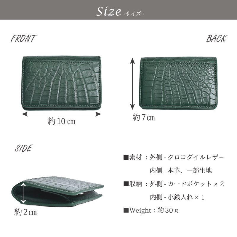 | 特徴 | 『本物へのこだわりは大人のステータス。皮革の宝石“クロコダイルスキン”の魅力。』 迫力のある模様と圧倒的な存在感が特徴的なクロコダイルに 落ち着いた雰囲気のマット加工を施したBOX型コインケースです。 『皮革の宝石』と称されるその革はとても美しく、使い込むほど 風合い豊かになっていきます。 『取り出しやすく便利な外側カードポケット』 小銭入れの表面にはキャッシュレス派には必須の外側カードポケットが 2箇所ある仕様になっており、財布を開ける事無くお会計時もスムーズに取り出せます。 さらに、折り畳んだお札を入れてミニ財布としても使えて、 現金派にもおすすめの小銭入れになってます。 『 Boxtipe Coin Purse 』 スナップボタンを開いてかぶせを開くと、側面の壁も立ち上がり、箱の様なボックス型が完成します。 内側には滑らかな羊革を使用。小銭が取り出しやすく、シンプルで使いやすいため人気の形です。 『ボックス型だから大きく開口して、キャッシュレスにも対応した使い勝手の良い小銭入れ』 箱型の特徴は、大きく開いて一目で確認できる仕様に加え、 ボックス型に立ち上がった小銭入れ部分は高さもあり、 取り出しの際に中身がこぼれにくいなどのメリットもあります。 小銭と一緒に折り畳んだ紙幣も収納可能です。 斑模様には細かい物から大きな模様まで様々あります。 それぞれ個体差と言う個性があり、全く同じ形、模様はございません。 これは天然の素材である証でもありますので、他には無い あなただけの腑柄をお愉しみ頂けましたら幸いでございます。 |